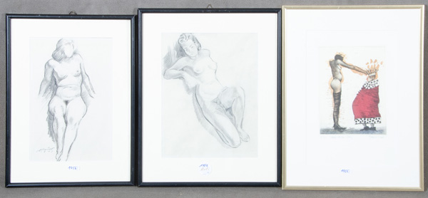 - Katalog-Nr: 1456Bodo W. Klos (*1952). „Kleiner, dicker König“. Farbradierung 8/50, mittig/u./bez., re./u./sign.; dazu zwei Bleistiftzeichnungen mit Aktdarstellungen, eine li./u./sign./dat. 1948. Je mit Passepartout hi./Gl. gerahmt, 20 x 14,5 bis 28 x 21 cm.o.L.