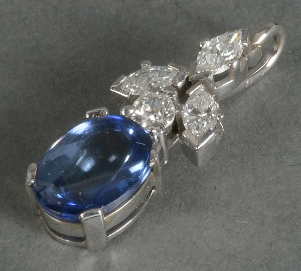 - Katalog-Nr: 1473Clipanhänger. 18 kt Gold, besetzt mit Saphir und sechs Diamanten, ca. 0,50 ct, Gesamtgewicht ca. 2,6 g. Die Begutachtungen der verarbeiteten Edelsteine und Diamanten wurden im gefassten Zustand vorgenommen, d.h. unter Vorbehalt einer sachgerechten Graduierung, die nur an ungefassten Steinen erfolgen kann. Dies hat zur Folge, dass die Gewichte (sog. "berechnete Gewichte", d.h. ca.+/- 10 % Abweichung) und Qualitäten (Farbe, Reinheit und Schliff) der Steine nur annähernd angegeben werden können.o.L.