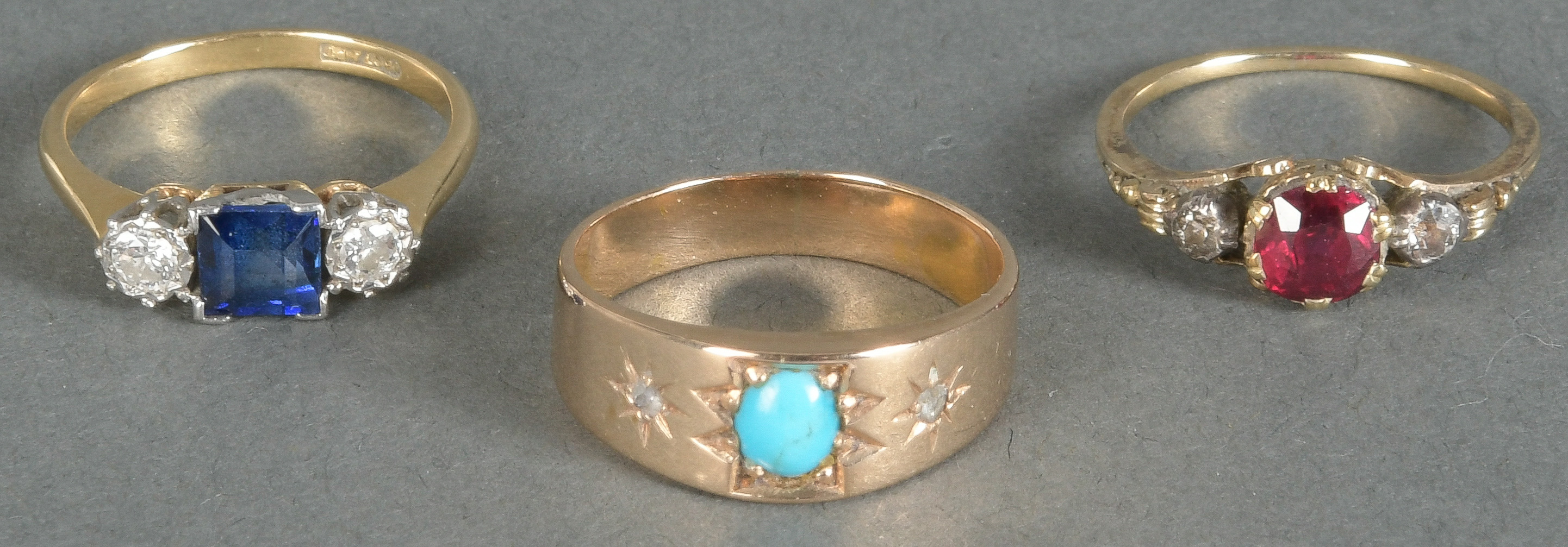 - Katalog-Nr: 1481Dreitlgs. Konvolut Damenringe: Zwei 14 kt Gold, besetzt mit Türkis / rubinfarbenem Stein, Gesamtgewicht ca. 5,5 g, Ringgröße 51 / 50; einer 18 kt Gold mit Platin, besetzt mit saphirfarbenem Stein und zwei Brillanten, ca. 0,10 ct, Gesamtgewicht 2,8 g, Ringgröße 50. Die Begutachtungen der verarbeiteten Edelsteine und Diamanten wurden im gefassten Zustand vorgenommen, d.h. unter Vorbehalt einer sachgerechten Graduierung, die nur an ungefassten Steinen erfolgen kann. Dies hat zur Folge, dass die Gewichte (sog. "berechnete Gewichte", d.h. ca.+/- 10 % Abweichung) und Qualitäten (Farbe, Reinheit und Schliff) der Steine nur annähernd angegeben werden können.o.L.