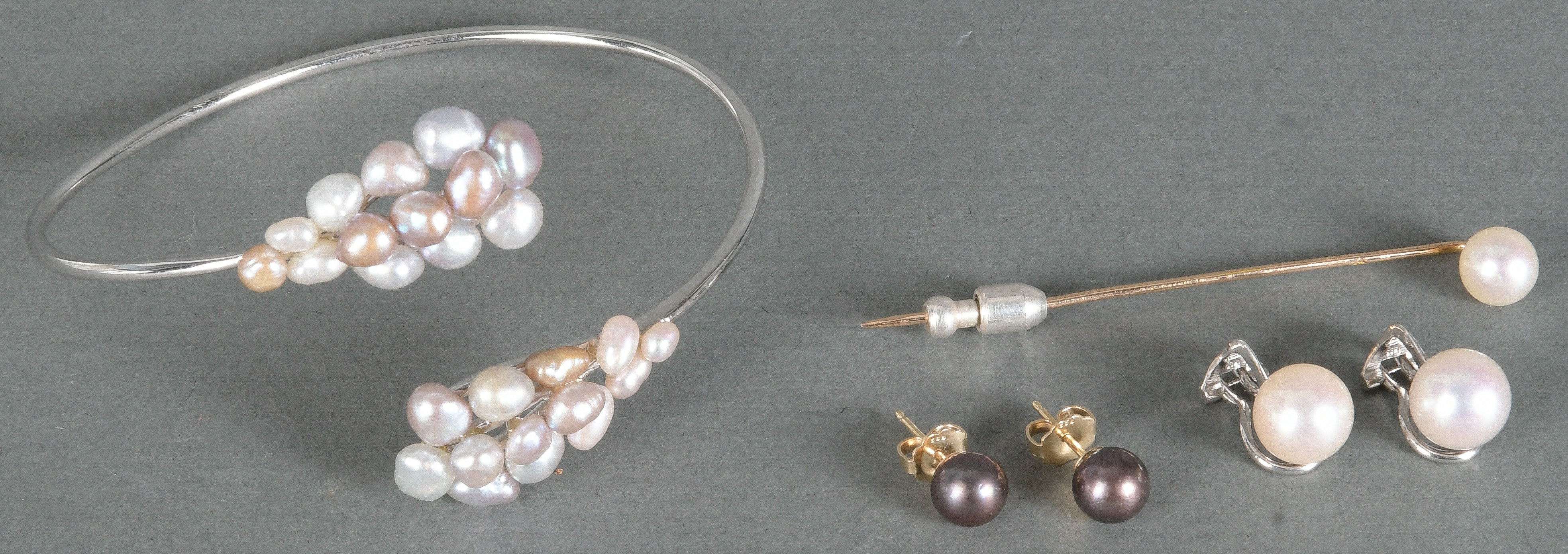 - Katalog-Nr: 1486Viertlgs. Schmuckkonvolut: Ein Armreif, ein Paar Ohrstecker, ein Paar Ohrclips, 14 kt Gold, besetzt mit Akoya-, Süßwasser- und Zuchtperlen, Gesamtgewicht ca. 17,8 g, sowie eine Krawattennadel, 18 kt Gold, ca. 1,4 g.o.L.
