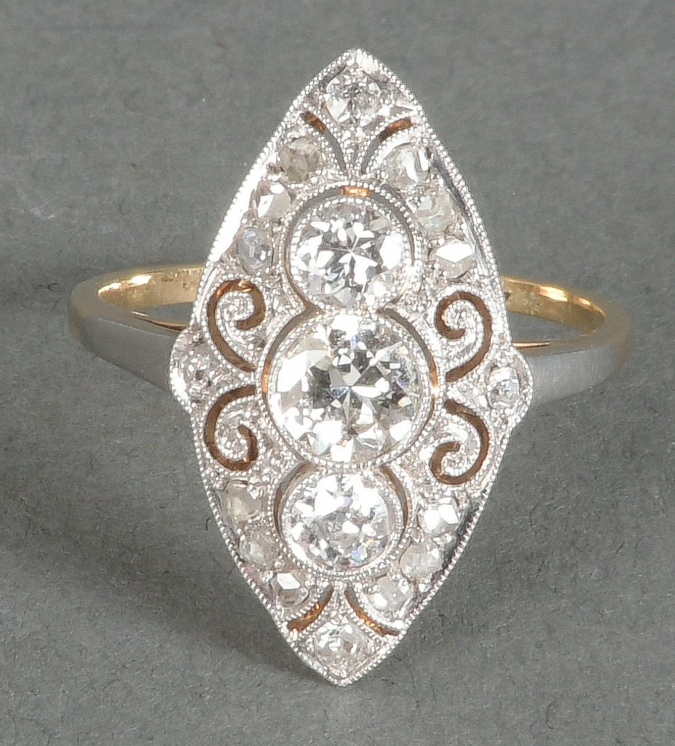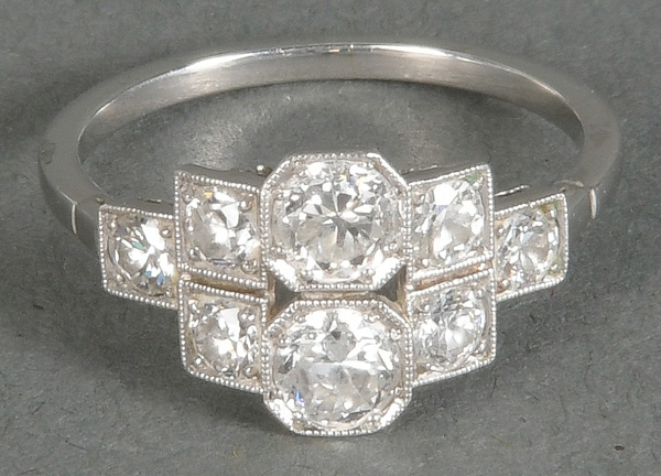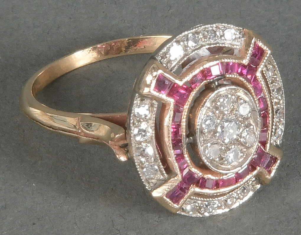 - Katalog-Nr: 1491Art Déco-Damenring. 14 kt Gold, besetzt mit Brillanten und Diamanten, ca. 0,60 ct, Gesamtgewicht ca. 2,9 g, Ringgröße 51/52. Die Begutachtungen der verarbeiteten Edelsteine und Diamanten wurden im gefassten Zustand vorgenommen, d.h. unter Vorbehalt einer sachgerechten Graduierung, die nur an ungefassten Steinen erfolgen kann. Dies hat zur Folge, dass die Gewichte (sog. "berechnete Gewichte", d.h. ca.+/- 10 % Abweichung) und Qualitäten (Farbe, Reinheit und Schliff) der Steine nur annähernd angegeben werden können.o.L.