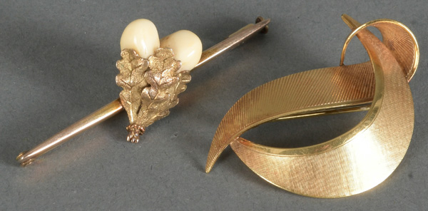 - Katalog-Nr: 1476Brosche. 8 kt Gold, besetzt mit Grandeln, Gesamtgewicht ca. 5,4 g; dazu eine Doublé-Brosche.o.L.