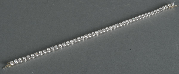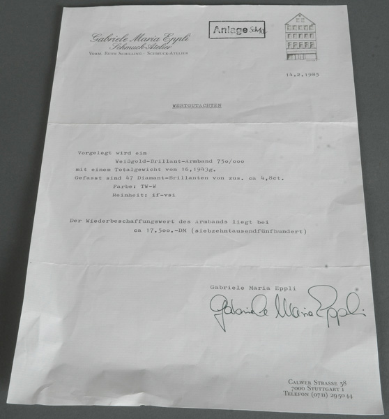 - Katalog-Nr: 1480Armband. 18 kt Gold, besetzt mit 47 Diamanten, ca. 4,8 ct, Gesamtgewicht ca. 16,19 g, L=19,2 cm. Mit Wertgutachen von Gabriele Maria Eppli vom 14.2.1985, Wiederbeschaffungswert DM 17.500,00. Die Begutachtungen der verarbeiteten Edelsteine und Diamanten wurden im gefassten Zustand vorgenommen, d.h. unter Vorbehalt einer sachgerechten Graduierung, die nur an ungefassten Steinen erfolgen kann. Dies hat zur Folge, dass die Gewichte (sog. "berechnete Gewichte", d.h. ca.+/- 10 % Abweichung) und Qualitäten (Farbe, Reinheit und Schliff) der Steine nur annähernd angegeben werden können.o.L.