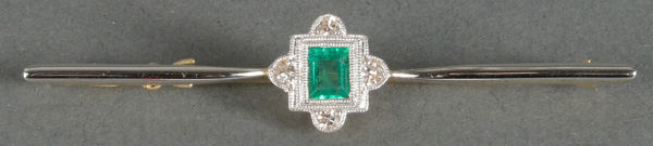 - Katalog-Nr: 1489Stabnadelbrosche. 14 kt Gold, besetzt mit Smaragd und Diamanten, ca. 0,06 ct, Gesamtgewicht ca. 3,1 g. Die Begutachtungen der verarbeiteten Edelsteine und Diamanten wurden im gefassten Zustand vorgenommen, d.h. unter Vorbehalt einer sachgerechten Graduierung, die nur an ungefassten Steinen erfolgen kann. Dies hat zur Folge, dass die Gewichte (sog. "berechnete Gewichte", d.h. ca.+/- 10 % Abweichung) und Qualitäten (Farbe, Reinheit und Schliff) der Steine nur annähernd angegeben werden können.o.L.