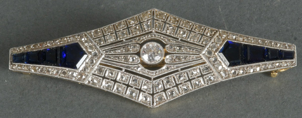 - Katalog-Nr: 1495Art Déco-Brosche. 18 kt Gold, besetzt mit saphirfarbenen Steinen, Altschliff-Brillanten, ca. 0,25 ct, und Diamantrosen, ca. 0,60 ct, Gesamtgewicht ca. 6,4 g. Die Begutachtungen der verarbeiteten Edelsteine und Diamanten wurden im gefassten Zustand vorgenommen, d.h. unter Vorbehalt einer sachgerechten Graduierung, die nur an ungefassten Steinen erfolgen kann. Dies hat zur Folge, dass die Gewichte (sog. "berechnete Gewichte", d.h. ca.+/- 10 % Abweichung) und Qualitäten (Farbe, Reinheit und Schliff) der Steine nur annähernd angegeben werden können.o.L.
