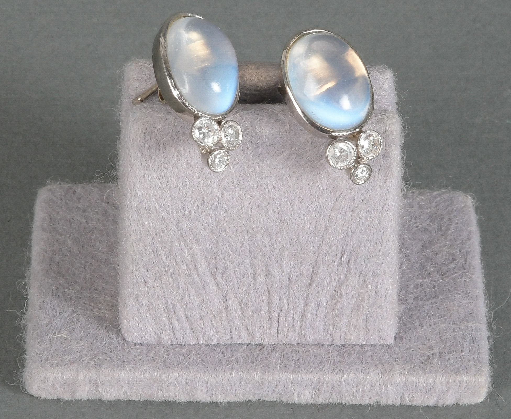 - Katalog-Nr: 1529Paar Ohrstecker. 14 kt Gold, besetzt mit Mondstein und Brillanten, ca. 0,35 ct, Gesamtgewicht ca. 6,5 g. Die Begutachtungen der verarbeiteten Edelsteine und Diamanten wurden im gefassten Zustand vorgenommen, d.h. unter Vorbehalt einer sachgerechten Graduierung, die nur an ungefassten Steinen erfolgen kann. Dies hat zur Folge, dass die Gewichte (sog. "berechnete Gewichte", d.h. ca.+/- 10 % Abweichung) und Qualitäten (Farbe, Reinheit und Schliff) der Steine nur annähernd angegeben werden können.o.L.