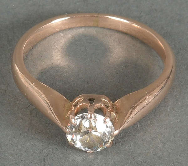 - Katalog-Nr: 1532Solitärring. 14 kt Gold, besetzt mit einem Brillanten, ca. 0,55 ct, Gesamtgewicht ca. 2,7 g, Ringgröße 52. Die Begutachtungen der verarbeiteten Edelsteine und Diamanten wurden im gefassten Zustand vorgenommen, d.h. unter Vorbehalt einer sachgerechten Graduierung, die nur an ungefassten Steinen erfolgen kann. Dies hat zur Folge, dass die Gewichte (sog. "berechnete Gewichte", d.h. ca.+/- 10 % Abweichung) und Qualitäten (Farbe, Reinheit und Schliff) der Steine nur annähernd angegeben werden können.o.L.