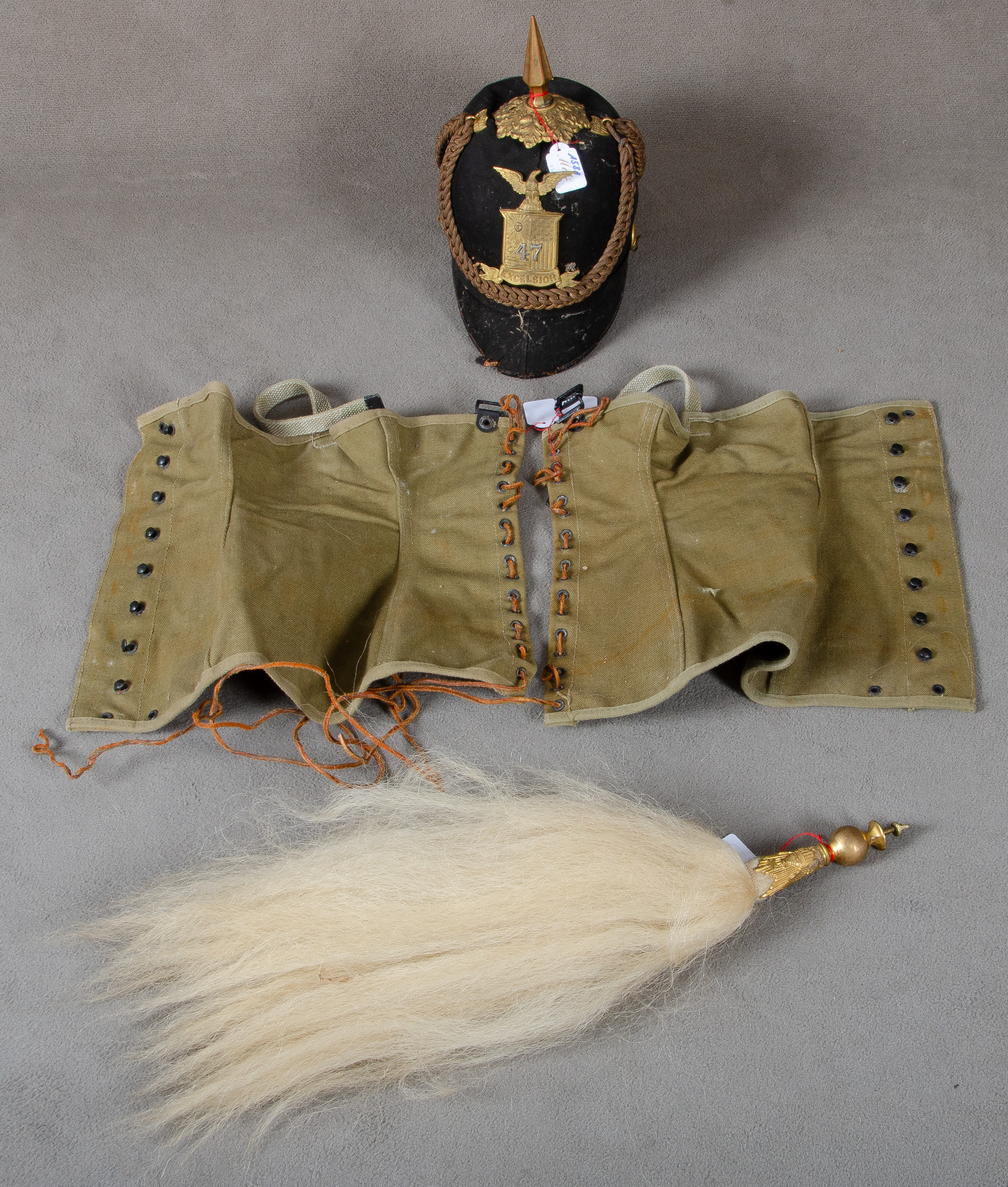 - Katalog-Nr: 1581Pickelhaube. Amerika 19. Jh. Schwarzer Filz mit Applikationen und Haarbusch; dazu zwei Gamaschen. (inkomplett, getragener Zustand, Kinnriemen fehlt)o.L.