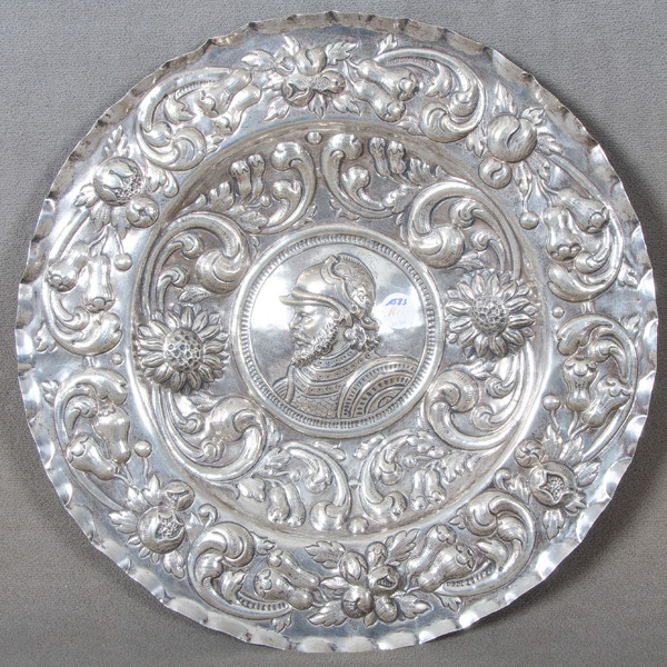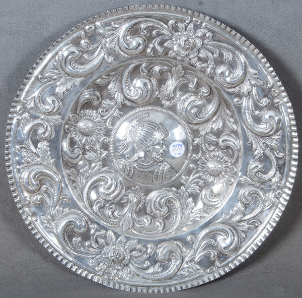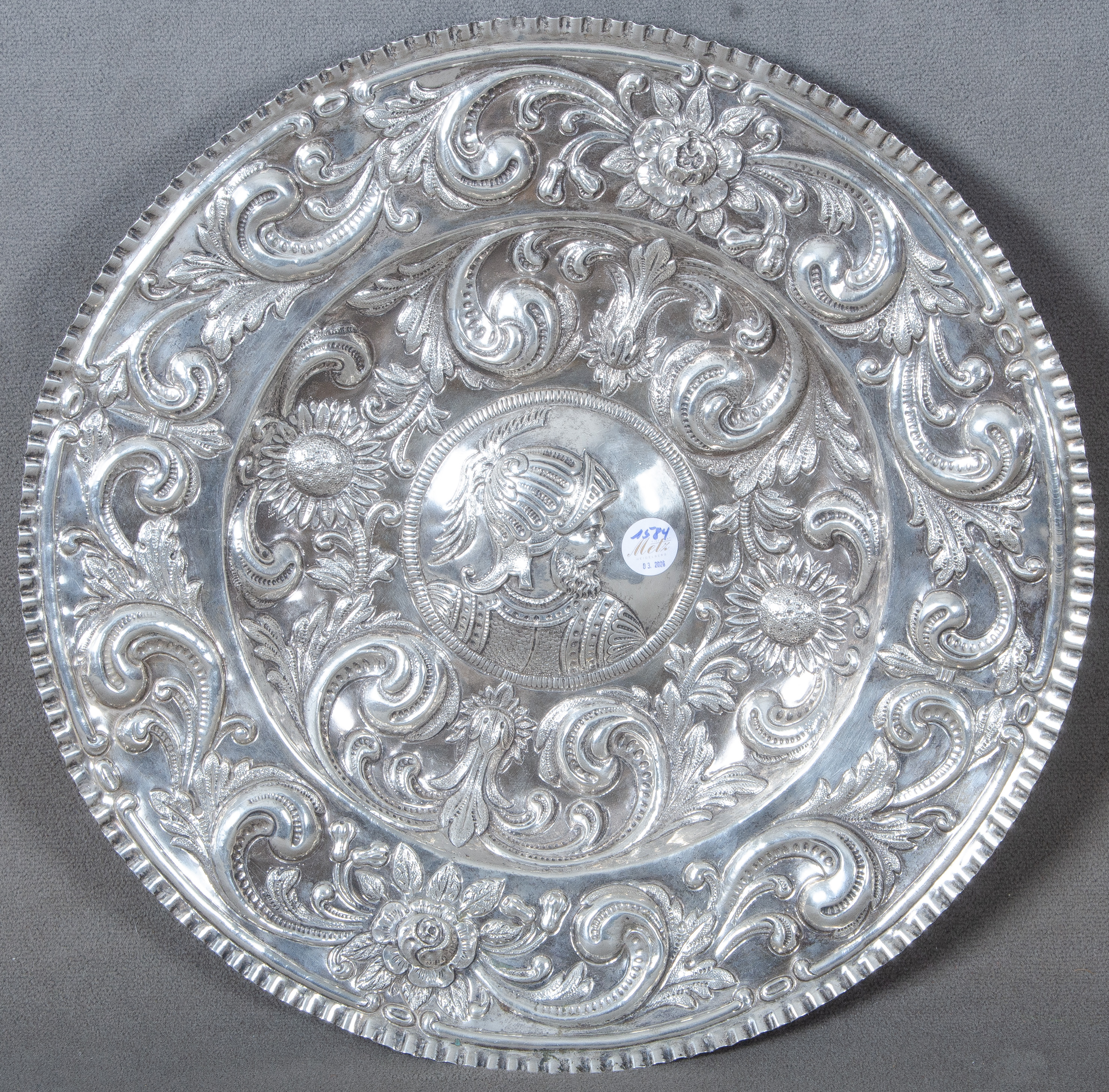 - Katalog-Nr: 1583Großer runder Prunkteller. Deutsch 20. Jh. Silber, ca. 1.645 g, gepunzt mit Buchstabe „S“; detailliert reliefiert mit Floraldekor und Ritterbüste, D=51,5 cm.o.L.