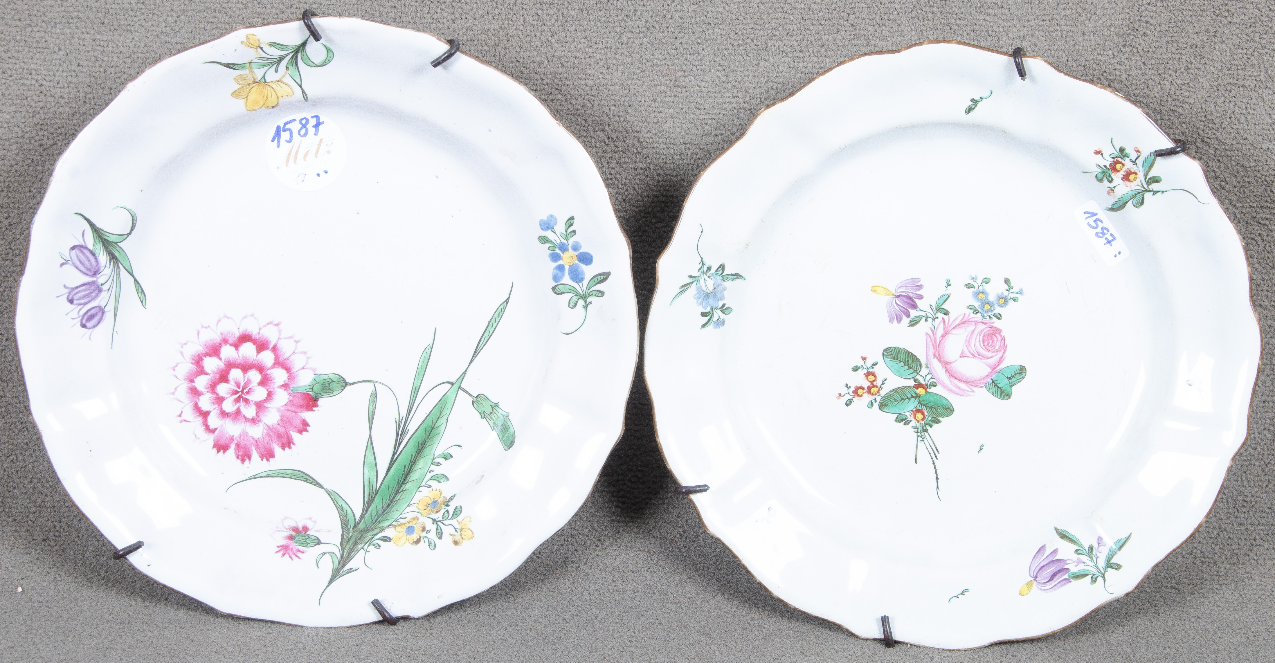 - Katalog-Nr: 1587Zwei Teller. Proskau. Fayence, bunt bemalt mit Floraldekor, D=22 / 23 cm.o.L.