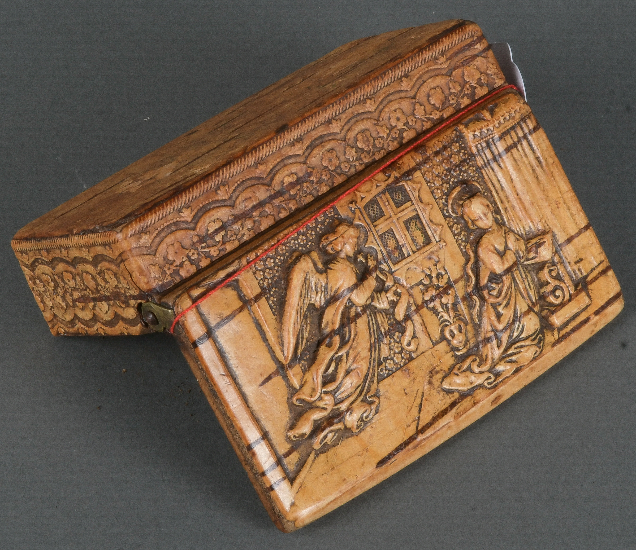 - Katalog-Nr: 1588Tabatière. Tirol um 1800. Massivholz, geschnitzt mit Engeln, H=3 cm, B=9,7 cm, T=5,3 cm.o.L.