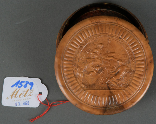 - Katalog-Nr: 1589Runde Deckeldose. Frankreich 18. Jh. Wurzelholz, geschnitzt mit mythologischer Szene und beschriftet, H=2,4 cm, D=8,2 cm.o.L.