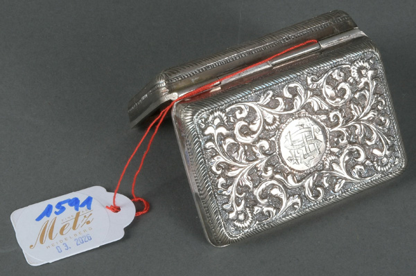 - Katalog-Nr: 1591Rechteckige Deckeldose. Wohl Italien um 1900. Silber, ca. 87 g, H=2 cm, B=7,5 cm, T=5,3 cm.o.L.
