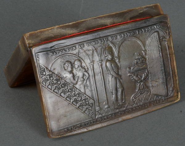 - Katalog-Nr: 1594Rechteckige Deckeldose. Paris 19. Jh. Horn, geschnitzt mit Szenerie Napoleon in Potsdam, H=1,8 cm, B=8,3 cm, T=5 cm.o.L.