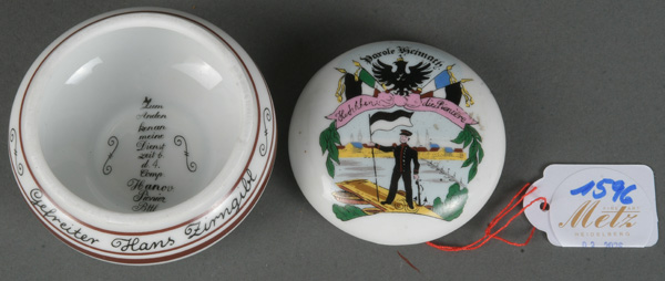 - Katalog-Nr: 1596Reservisten-Deckeldose. Deutsch um 1914. Mit dem Marinesoldaten „Gefreiter Hans Zirngibl“, H=4,8 cm, D=7,5 cm.o.L.