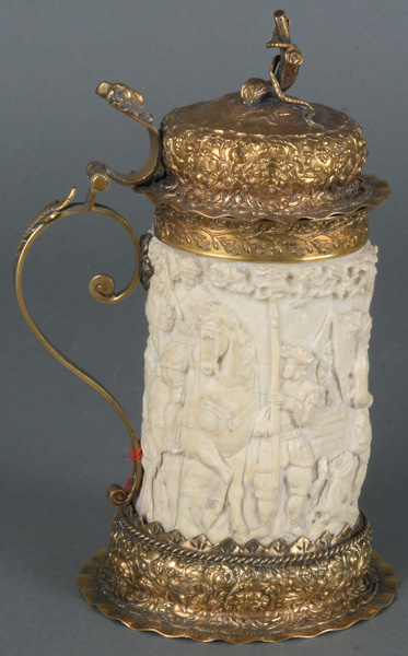 - Katalog-Nr: 1600Prunkkrug. Deutsch 19. Jh. Silber, reich ziseliert und vergoldet, H=16,7 cm.o.L.