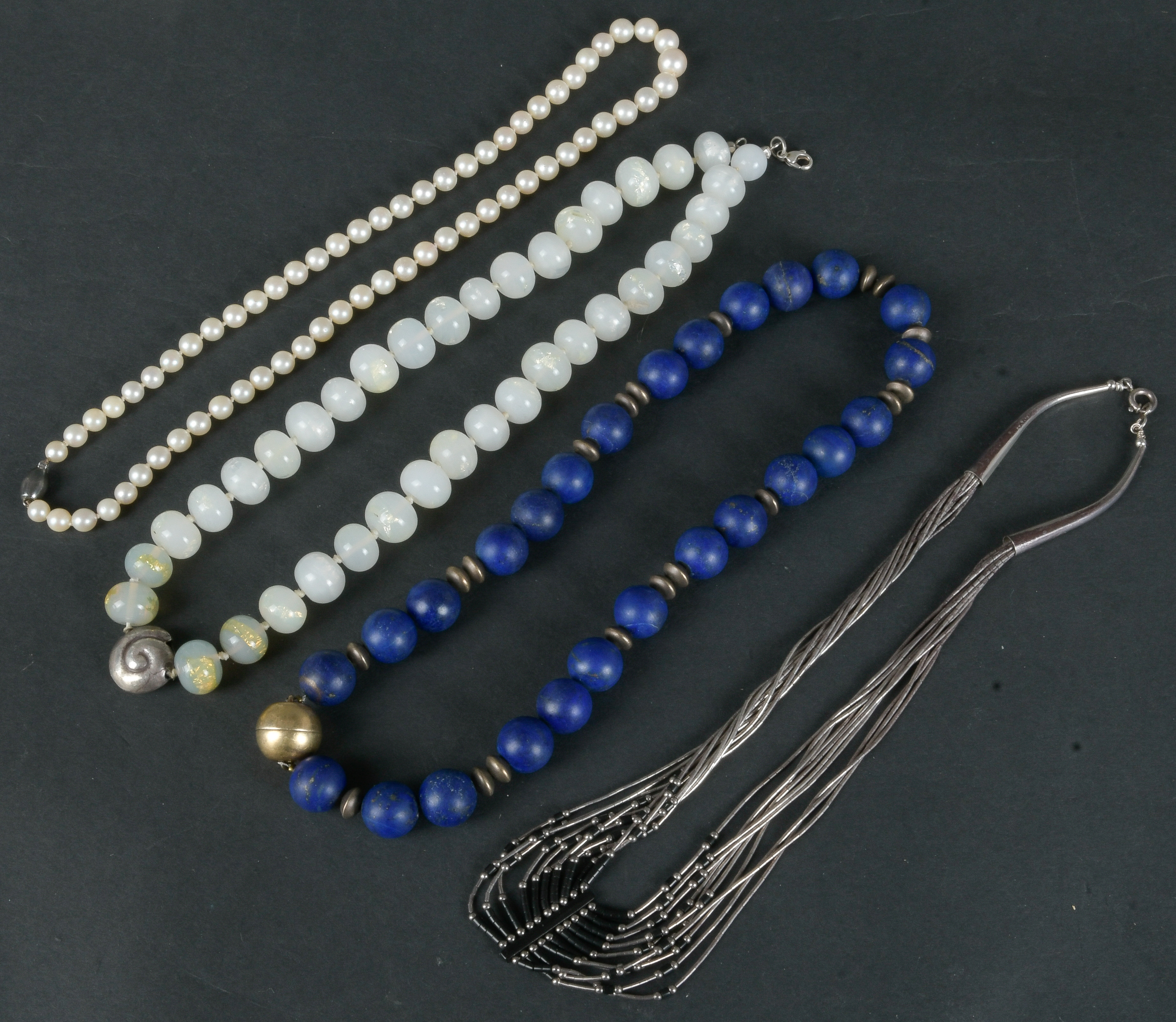 - Katalog-Nr: 1626Ein Collier und drei Halsketten. Lapislazuli, Muranoglas, Zuchtperlen mit Silberverschluss, L=je 45 cm.o.L.