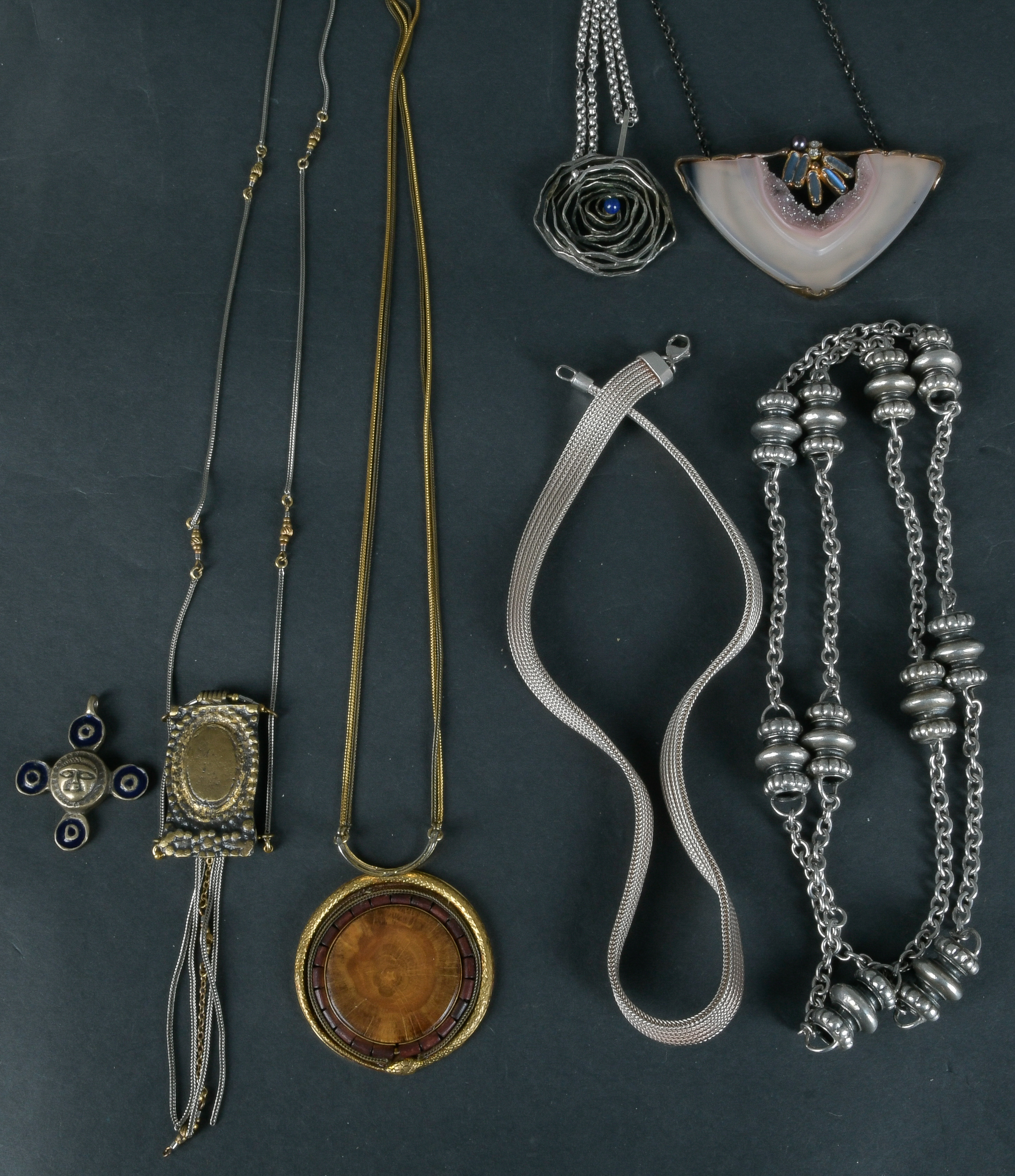 - Katalog-Nr: 1627Konvolut Silber-Schmuck, ca. 319 g, u.a. Replik der Wormser Maskenfibel (Zertifkat des Museums der Stadt Worms), Collier, Halsreif, Halsketten, u.a. besetzt mit Amethyst und Mondstein, L=42 bis 90 cm.o.L.