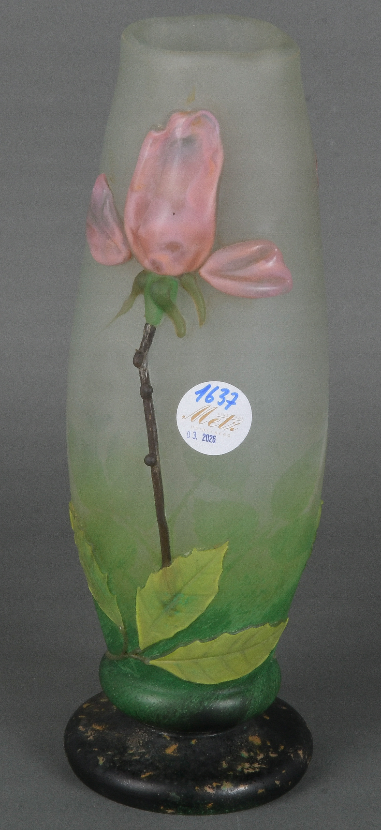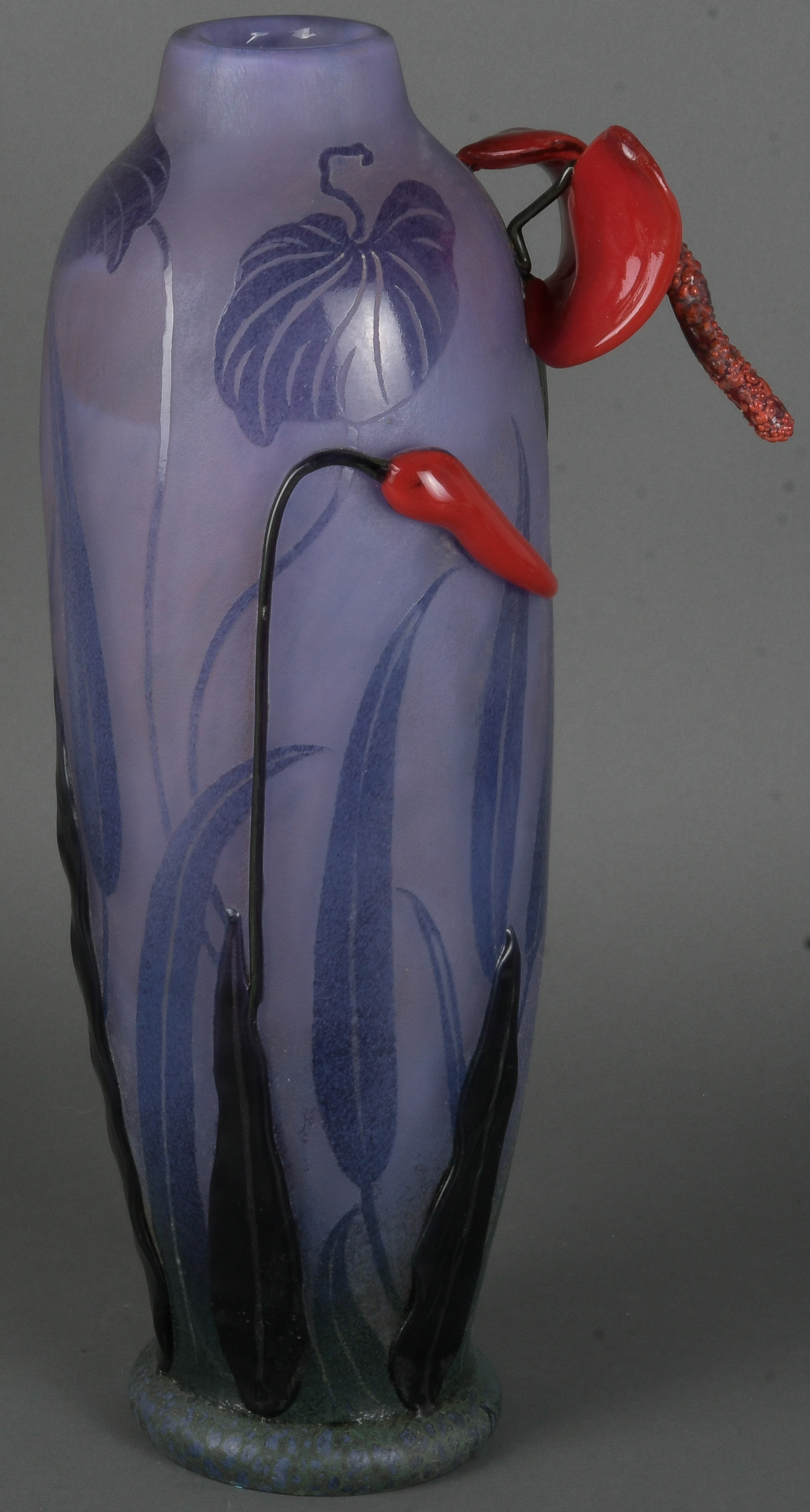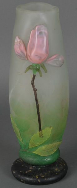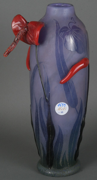 - Katalog-Nr: 1635Hohe Vase. Nancy, Daum. Farbloses Glas, farbig überfangen mit Aufschmelzungen; am Rand bezeichnet, H=41 cm.o.L.