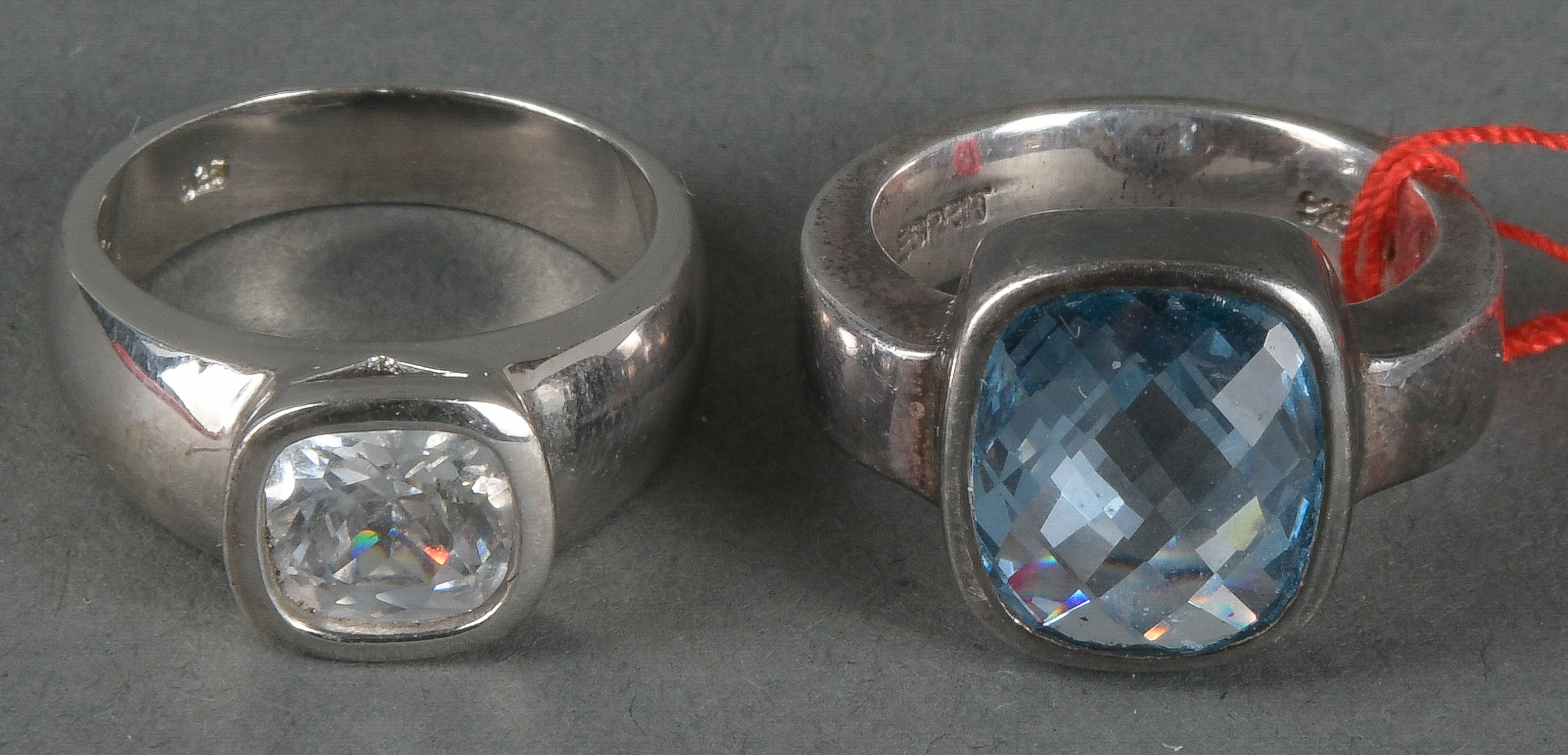 - Katalog-Nr: 1643Zwei Damenringe. Silber, besetzt mit Farbsteinen, Gesamtgewicht ca. 16,7 g, Ringgröße je 57.o.L.