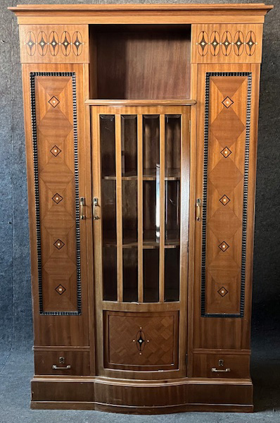 - Katalog-Nr: 1644Jugendstil-Vitrine. Wohl Darmstadt 1910-20. Mahagoni furniert, teilw. massiv, marketiert mit geometrischem Dekor, ebonisierte Flammleisten; gerade Sockelleiste, leicht nach vorne gewölbtes Mittelelement, flankiert von je einem Schub und darüber liegender Tür, Mitteltür mit facettierter Verglasung, darüber offenes Fach, profilierte Abschlussleiste, H=181 cm, B=101 cm, T=37 cm. >>> Diese Los Nr. kann am Fr., den 10.04.26 (10.00 h bis 12.00 h) in unserem Depot in Mannheim abgeholt werden.o.L.