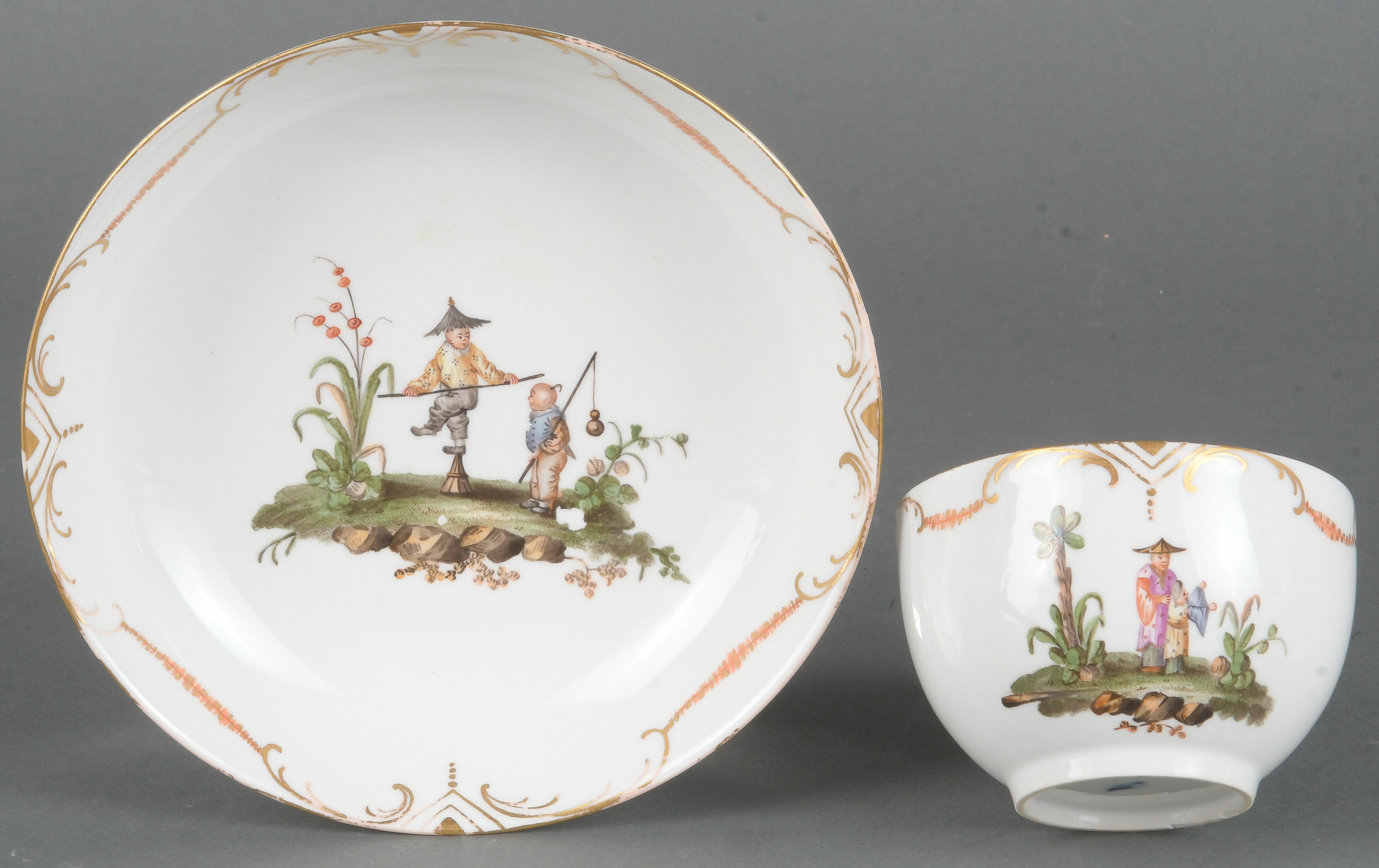 - Katalog-Nr: 1646Tasse mit Unterschale. Fürstenberg 1765-70. Beide Teile bunt bemalt mit Chinoiseriendekor, gold staffierter Lippenrand. Porzellan, am Boden. Vgl. Museum August Kestner, Hannover.o.L.