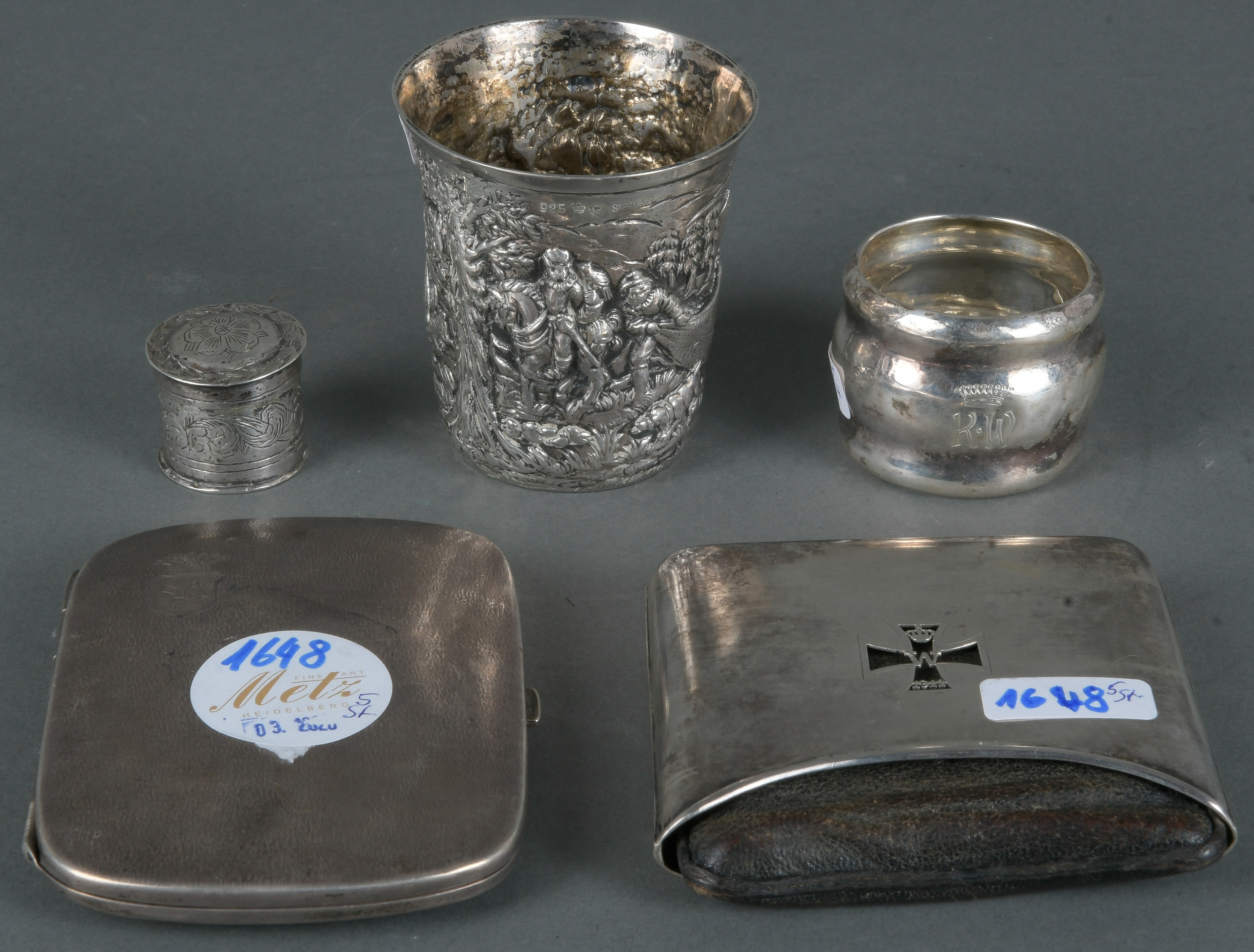 - Katalog-Nr: 1648Fünftlgs. Konvolut Silber. Deutsch, 1914 und später. 800er / 925er Sterlingsilber. Bestehend aus: Reliefbecher, Serviettenring, zwei Zigarettenetuis (eines I. WK)und Fingerhut mit passendem Etui.o.L.