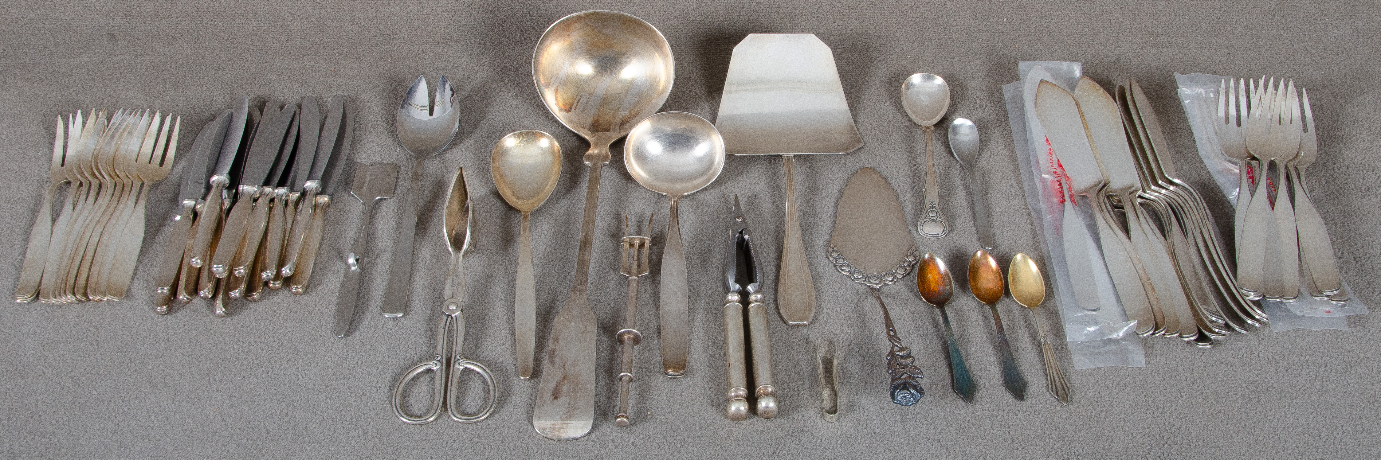 - Katalog-Nr: 1650Konvolut versilberte Besteckteile: Messer, Gabel, Löffel, Zuckerzange und div. Vorlegeteile.o.L.