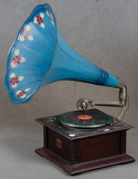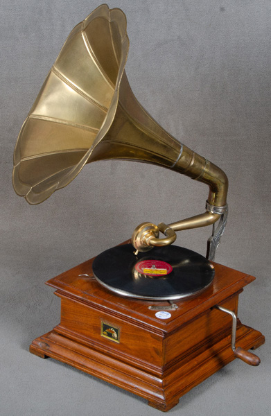 - Katalog-Nr: 1628Grammophon. Wohl USA „His Master's Voice“. Massiv Nussbaum mit Messing-Trichter; dazu eine Platte in rechteckigem, profilierten Kasten, H=71 cm, B=36 cm, T=36 cm. (Funktion ungeprüft)o.L.