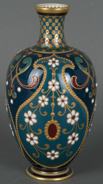 - Katalog-Nr: 1636Ausgefallene Jugendstil-Vase. Berlin um 1905. Porzellan, farbig glasiert mit aufwendiger, mehrfarbiger Emailmalerei und Reliefgold; am Boden unterglasurblaue Szeptermarke mit korallenrotem „KPM“ und Reichsapfel, H=20,8 cm.o.L.