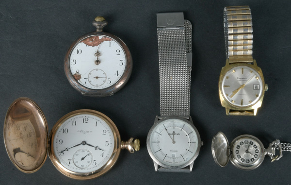 - Katalog-Nr: 1638Konvolut Armband- und Taschenuhren, u.a. „Dugena“ und „Elgin“. Versilbert / vergoldet. (Funktion ungeprüft)o.L.