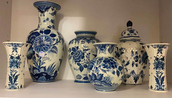 - Katalog-Nr: 1640Sechs unterschiedliche Vasen. Delft 20. Jh. Fayence, blau bemalt mit Floraldekor; am Boden gemarkt, eine Vase mit Deckel, H=21 bis 49 cm.o.L.