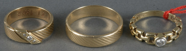 - Katalog-Nr: 1641Drei Damenringe. 14 kt Gold, besetzt mit Brillanten, ca. 0,25 ct, Gesamtgewicht ca. 16,6 g, Ringgröße 56 / 57 / 58. Die Begutachtungen der verarbeiteten Edelsteine und Diamanten wurden im gefassten Zustand vorgenommen, d.h. unter Vorbehalt einer sachgerechten Graduierung, die nur an ungefassten Steinen erfolgen kann. Dies hat zur Folge, dass die Gewichte (sog. "berechnete Gewichte", d.h. ca.+/- 10 % Abweichung) und Qualitäten (Farbe, Reinheit und Schliff) der Steine nur annähernd angegeben werden können.o.L.