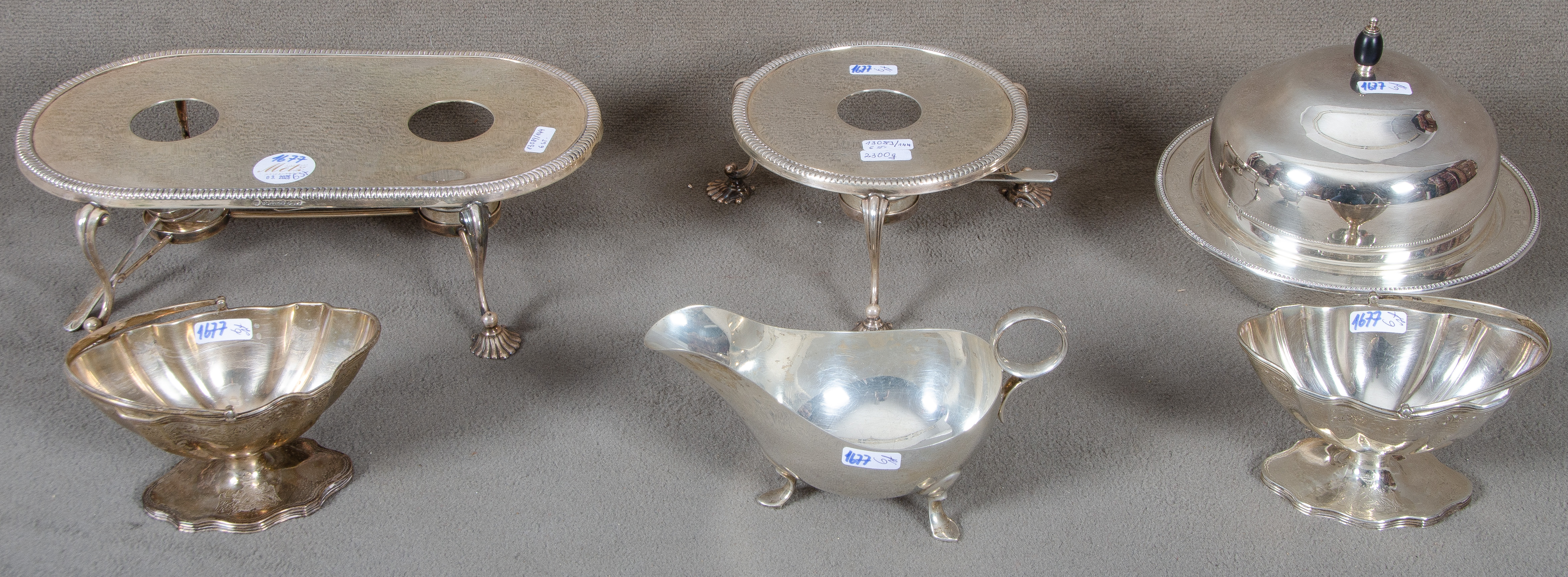 - Katalog-Nr: 1677Sechstlgs. Konvolut 925er Sterlingsilber, ca. 2.300 g. Bestehend aus: Rechaud, Deckeldose, Henkelschalen und Saucière, H=8,8 bis 15 cm.o.L.