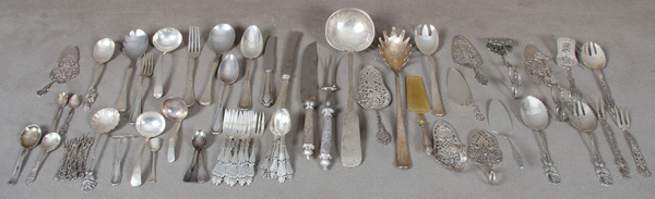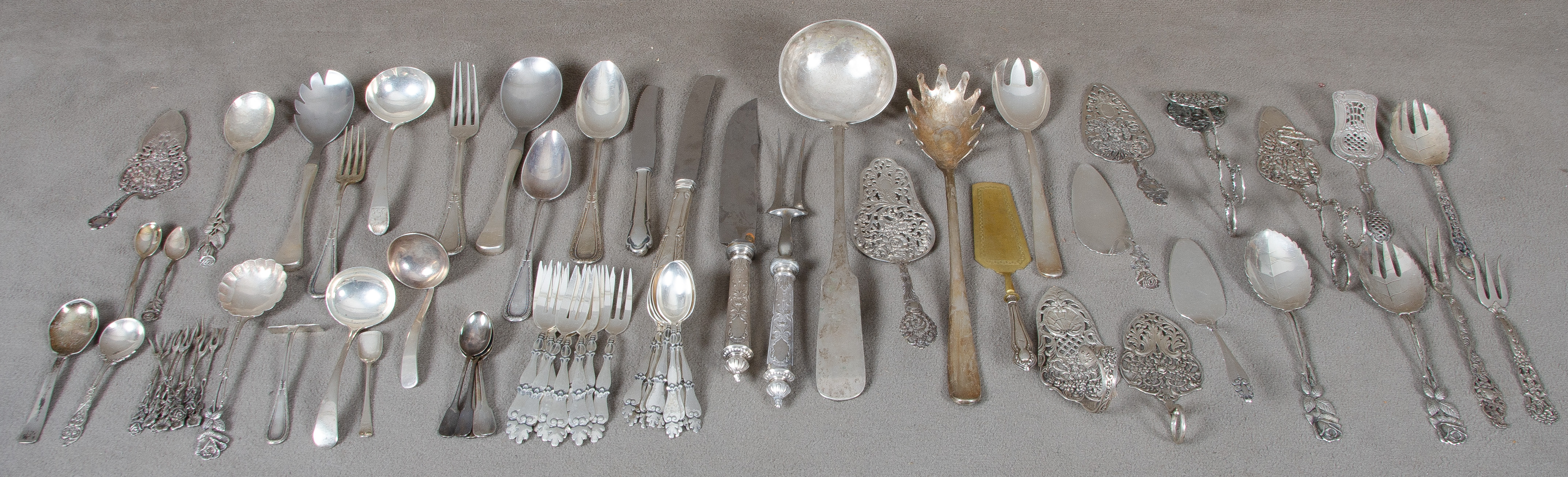 - Katalog-Nr: 1678Konvolut Besteckteile. Silber, ca. 3.000 g. Bestehend aus: Suppenkelle, Tortenheber, Messer, Gebäckzangen, Mokkalöffel, Vorlegeteile und Salatbesteck.o.L.