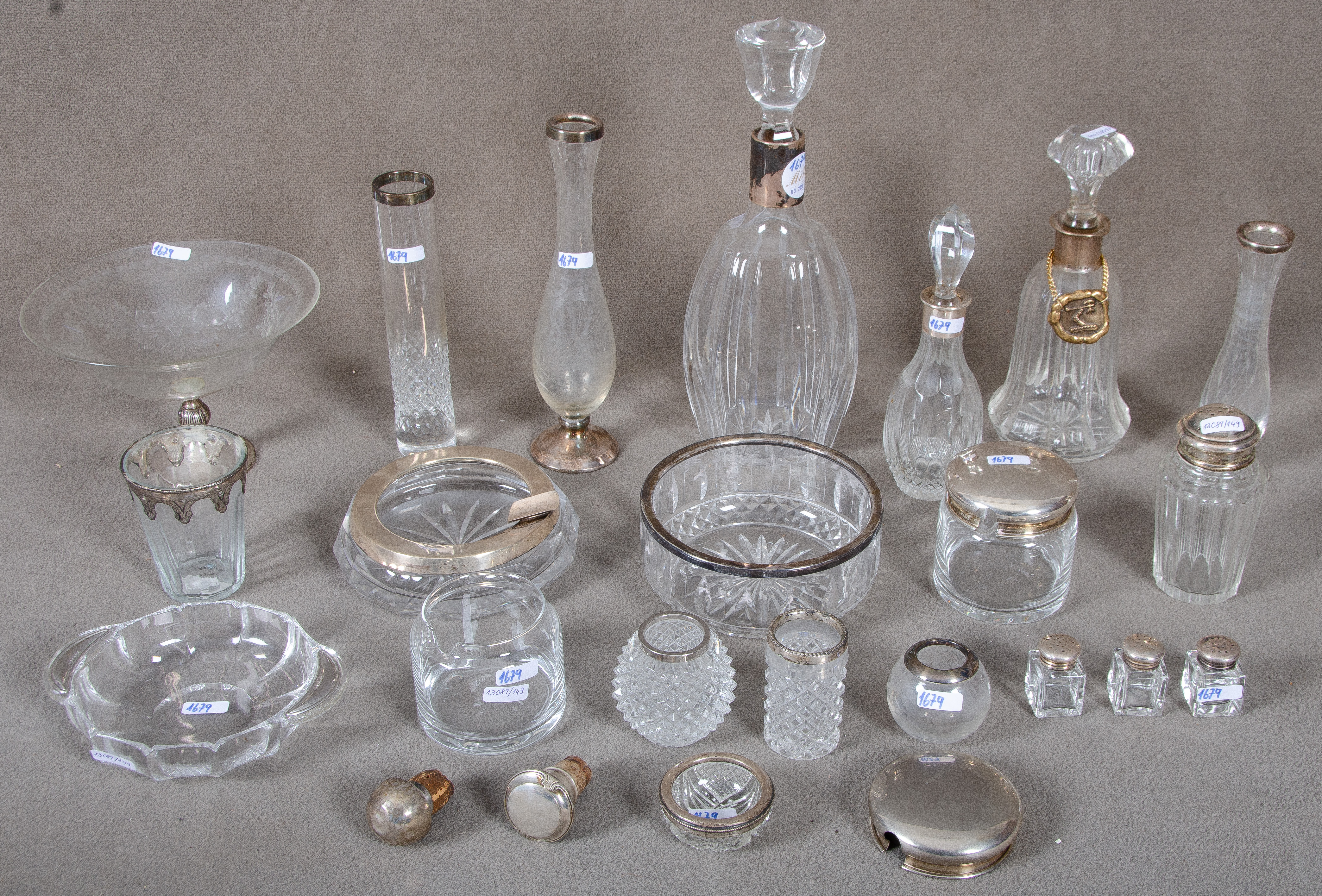 - Katalog-Nr: 1679Konvolut Glasgefäße, teilw. geschliffen, mit Silbermontur, u.a. Karaffen, Schalen und Vasen.o.L.