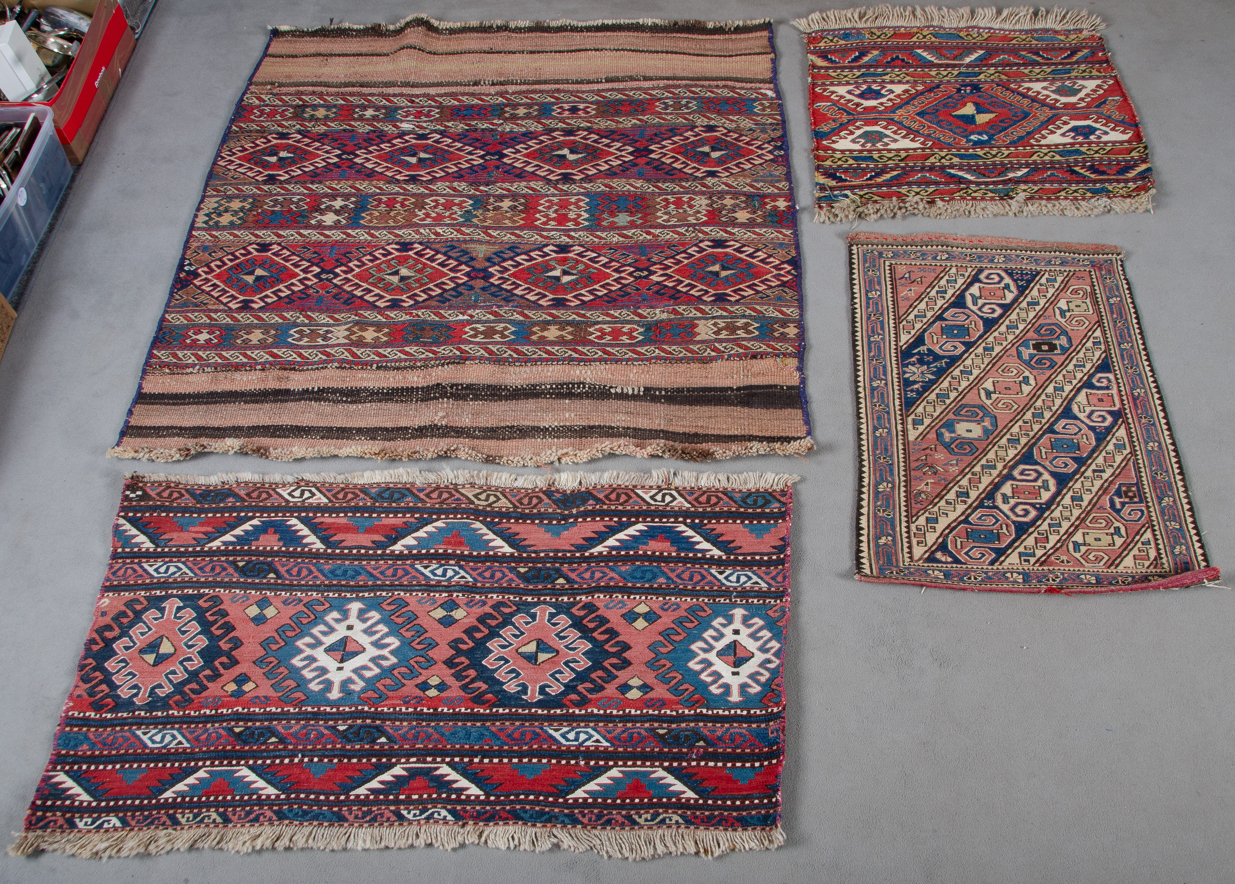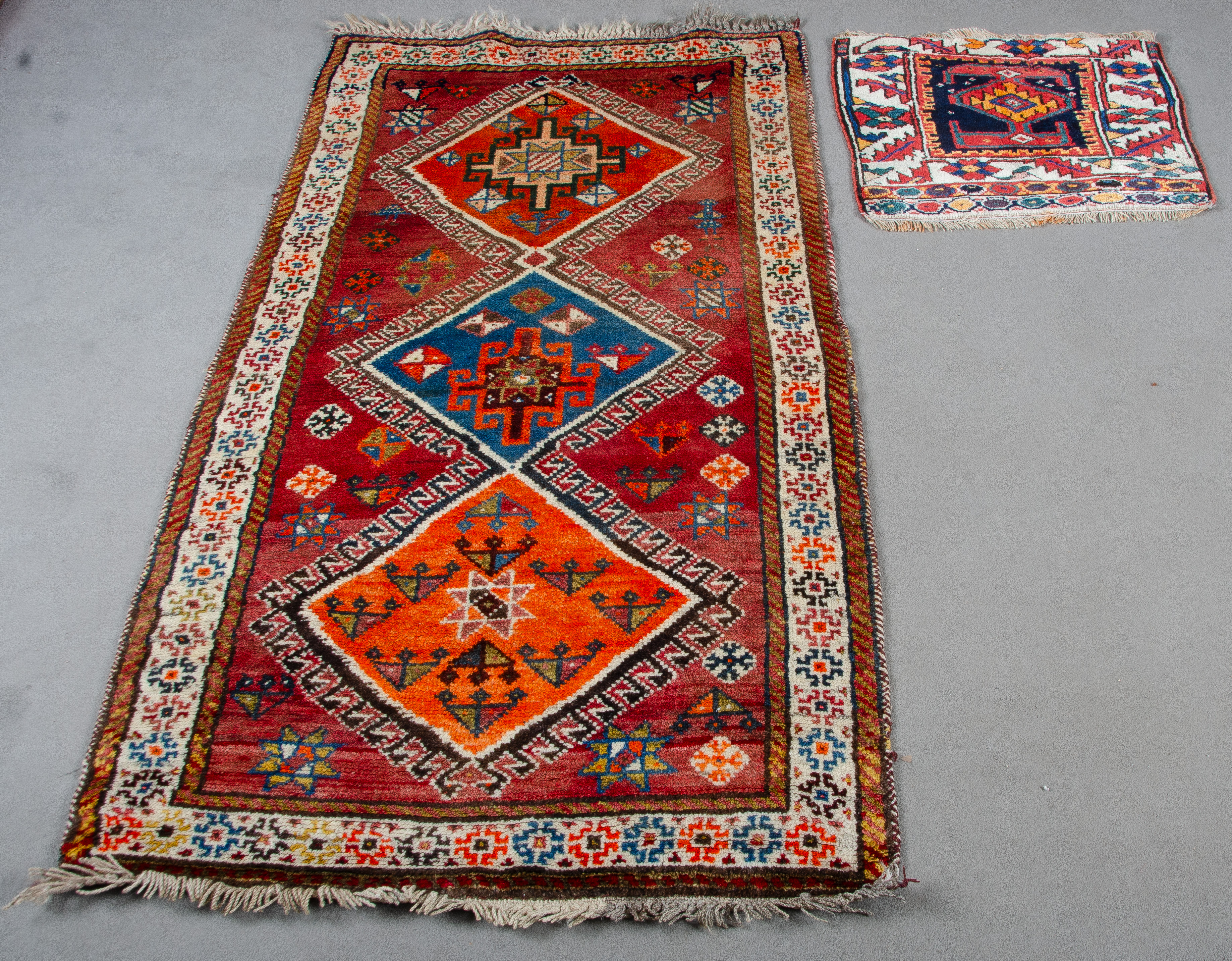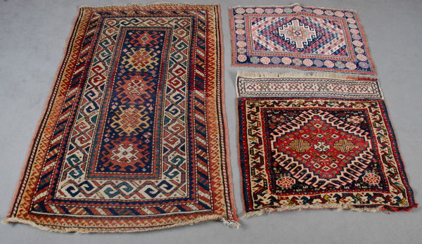 - Katalog-Nr: 1691Zwei kaukasische Brücken und eine Kaschkai-Tasche, 130 x 82 / 68 x 68 / 70 x 53 cm. Zertifikat zu einem Stück der GALERIE OSTLER, München, liegt vor.o.L.