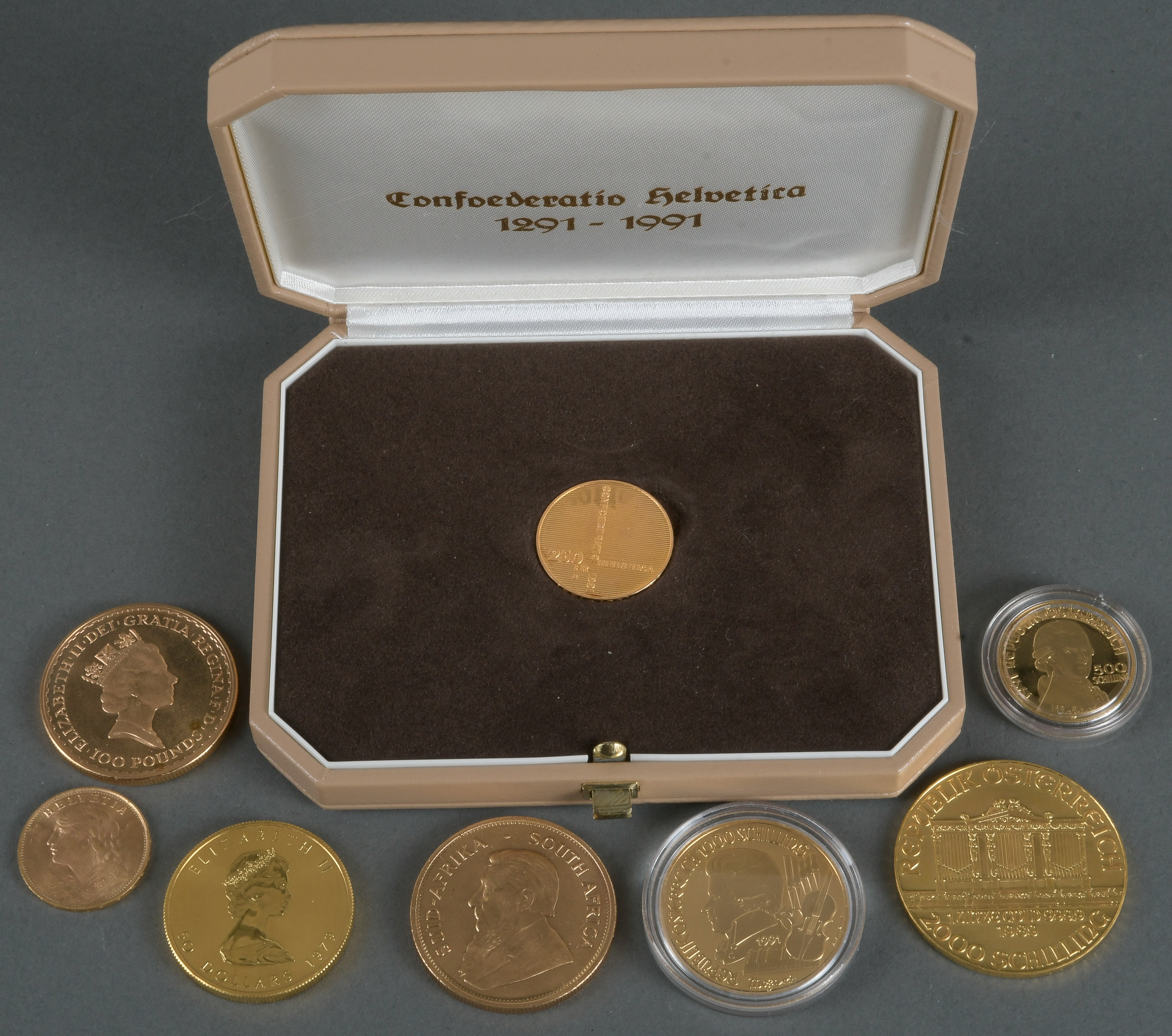 - Katalog-Nr: 1694Konvolut Goldmünzen, ca. 169 g. Bestehend aus: Krügerrand (1 oz.), Mozart Gedenkmünzen in 500 und 1000 Schilling, 250 CHF Gedenkmünze, Wiener Philharmoniker 2000 Schilling (1 oz.), Britannica Goldmünze (1 oz.), Canadian Maple Leaf (1 oz.) und ein Goldvreneli.o.L.