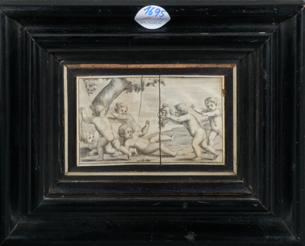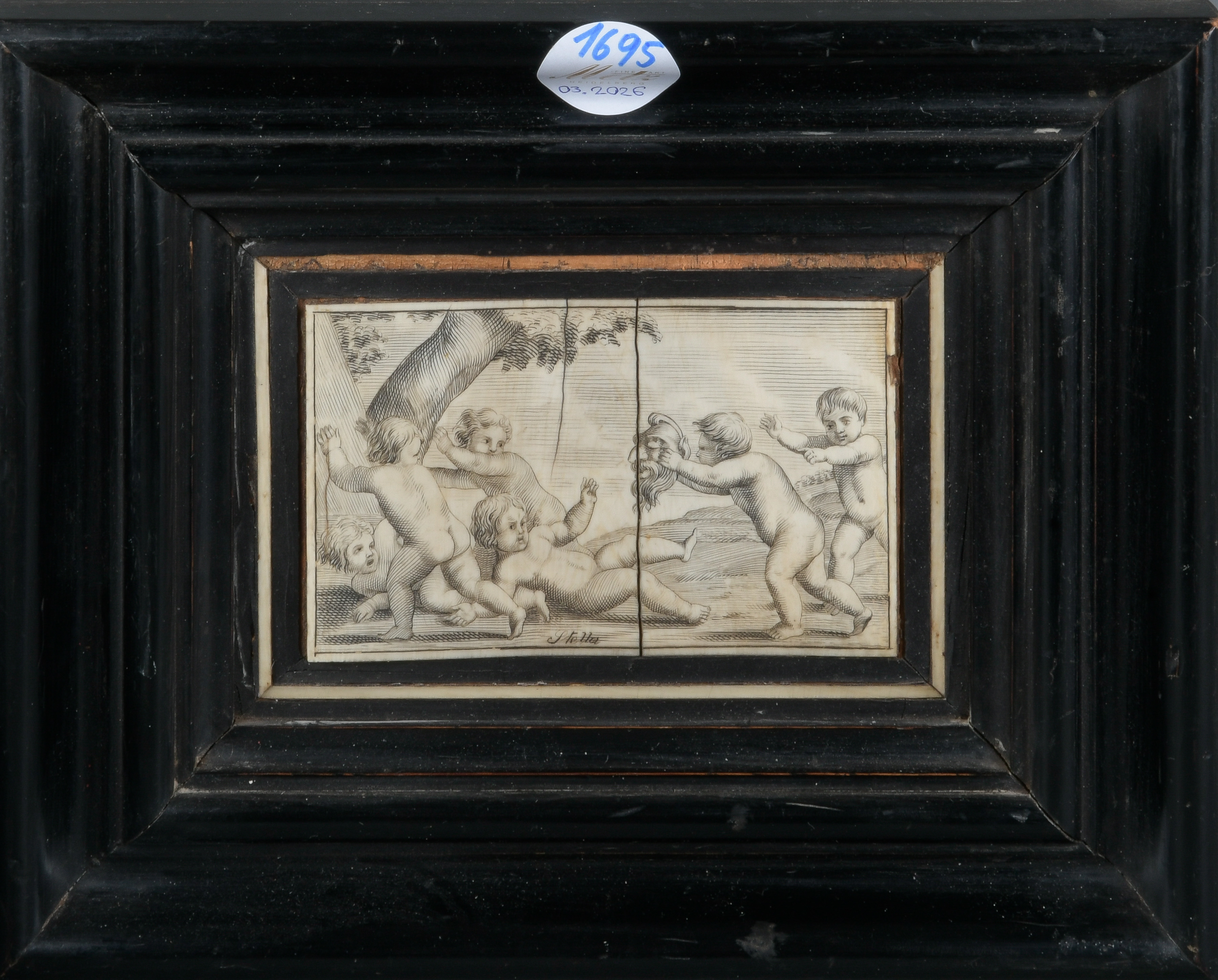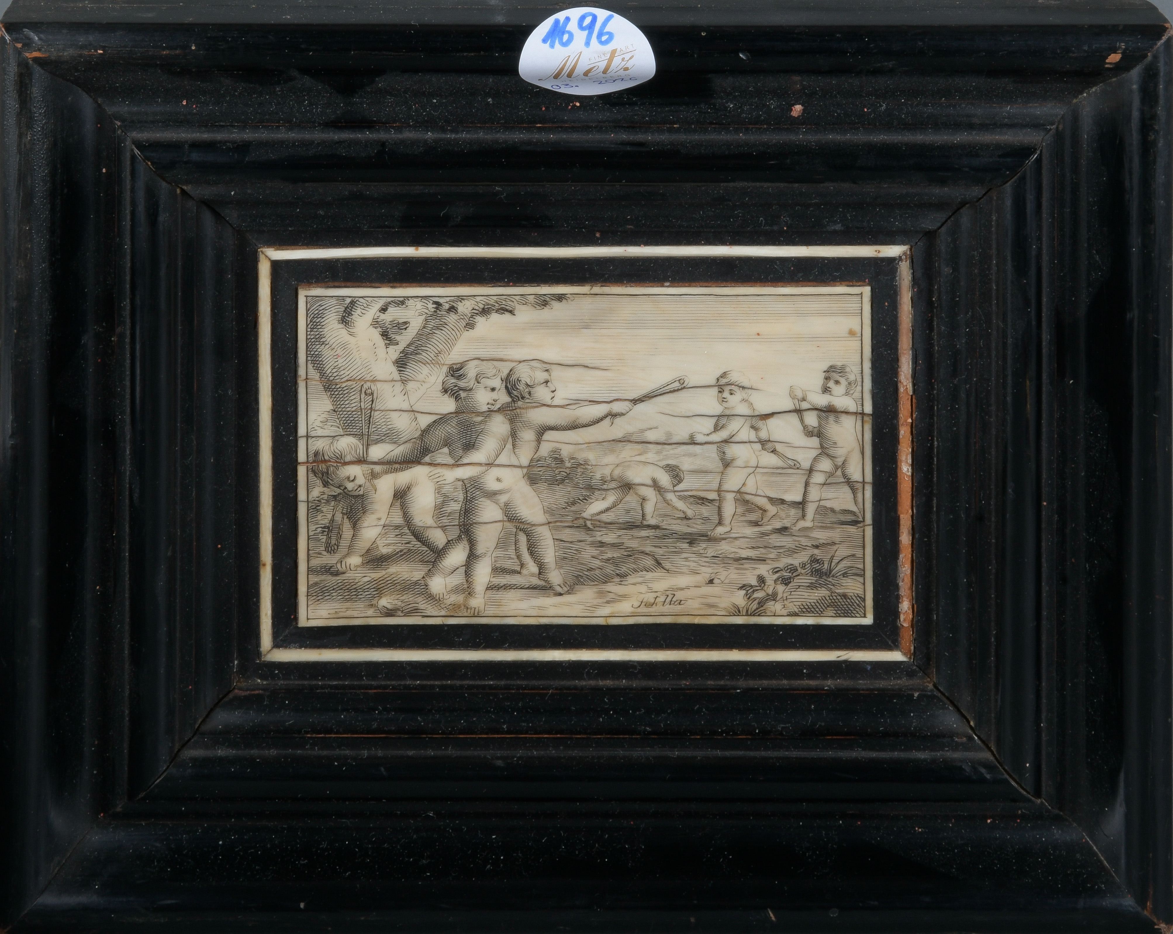 - Katalog-Nr: 1695Süddeutscher Meister des 19. Jhs. Hornplatte, museal graviert mit Putto in Landschaft, mittig sign. „Satella“, in ebonisiertem Rahmen, 8 x 12,5 / 21 x 26 cm.o.L.