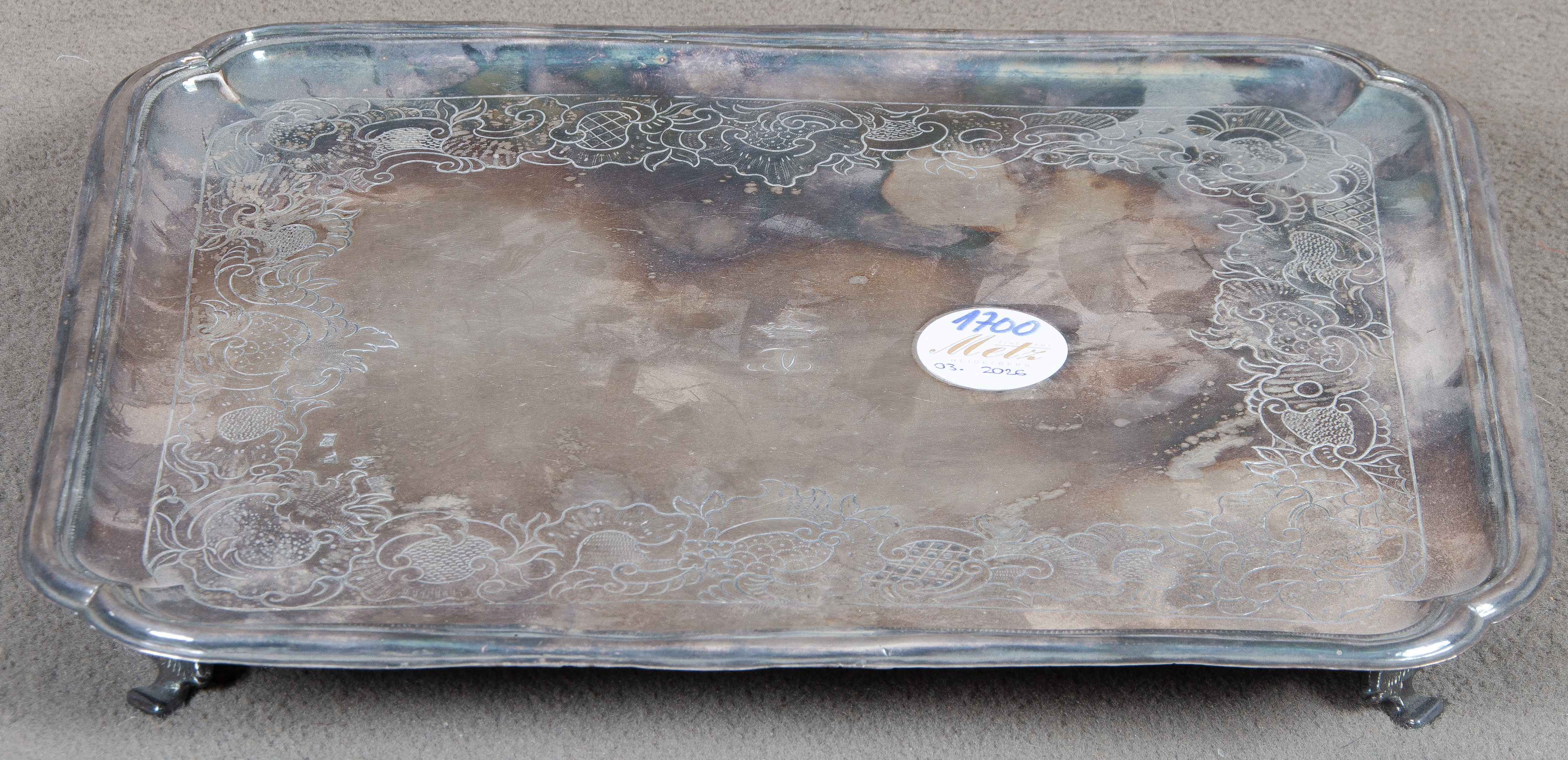 - Katalog-Nr: 1700Tablett. Moskau 1763. Silber, ca. 516 g, am Boden mit Jahresziffer, Stadt- und Meisterpunze „BA“ für Fedor Petrow Alderman; auf vier Füßen stehend, Spiegel ziseliert mit bekröntem Monogramm „AJ“, umgeben von Rocailledekor (H=3,3 cm, B=29 cm, T=24 cm). Provenienz: Aus altem süddeutschen Privatbesitz. Vgl. Goldberg, Nr. 630.o.L.