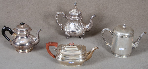 - Katalog-Nr: 1676Vier Kaffee- bzw. Teekannen. 800er bis 925er Sterlingsilber, ca. 2.800 g, H=12,5 bis 24,3 cm.o.L.