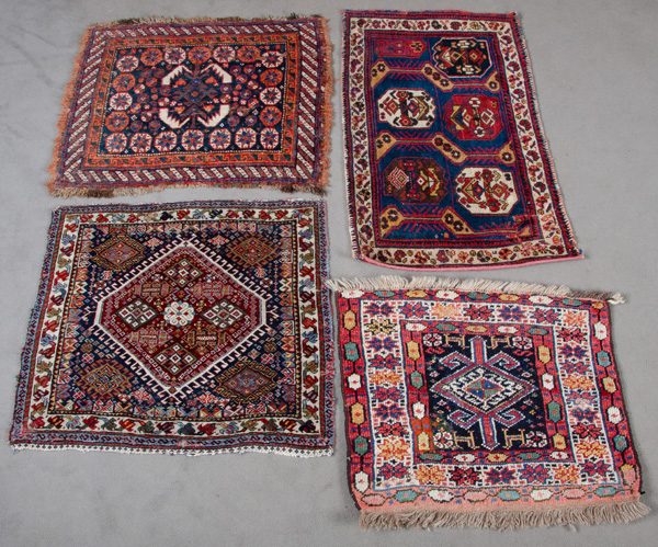 - Katalog-Nr: 1693Eine Afschari-Tasche und drei kaukasische Brücken, 41 x 53 / 52 x 58 / 51 x 59 / 46 x 73 cm. Zertifikat zu einem Stück der GALERIE OSTLER, München 13.07.1978, inkl. Rechnung über DM 280,00 liegt vor.o.L.