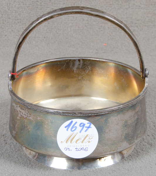 - Katalog-Nr: 1697Henkelschale. Moskau 1880. Silber, ca. 203 g, am Boden Stadt- und Meisterpunze für bekannten, aber nicht identifizierten Meister. Walzenförmig, mit beweglichem Bügelhenkel, ziseliert mit Ähren, Rechen und Sichel (H=6,3 cm, D=10,9 cm). Provenienz: Aus altem süddeutschen Privatbesitz. Vgl. Goldberg Nr. 531 und 277.o.L.