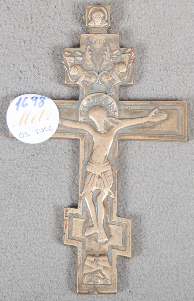 - Katalog-Nr: 1698Pectorale. Russland 19./20. Jh. Bronze, reliefiert und ziseliert. Provenienz: Aus altem süddeutschen Privatbesitz, H=16,5 cm, B=10,2 cm, T=0,9 cmo.L.