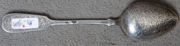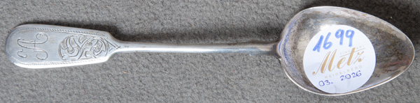 - Katalog-Nr: 1699Löffel. Russland 19. Jh. Silber, ca. 32 g, verso verschlagene Meisterpunze. Mit floral ziseliertem Griff und Rückseite der Laffe (L=17 cm). Provenienz: Aus altem süddeutschen Privatbesitz.o.L.