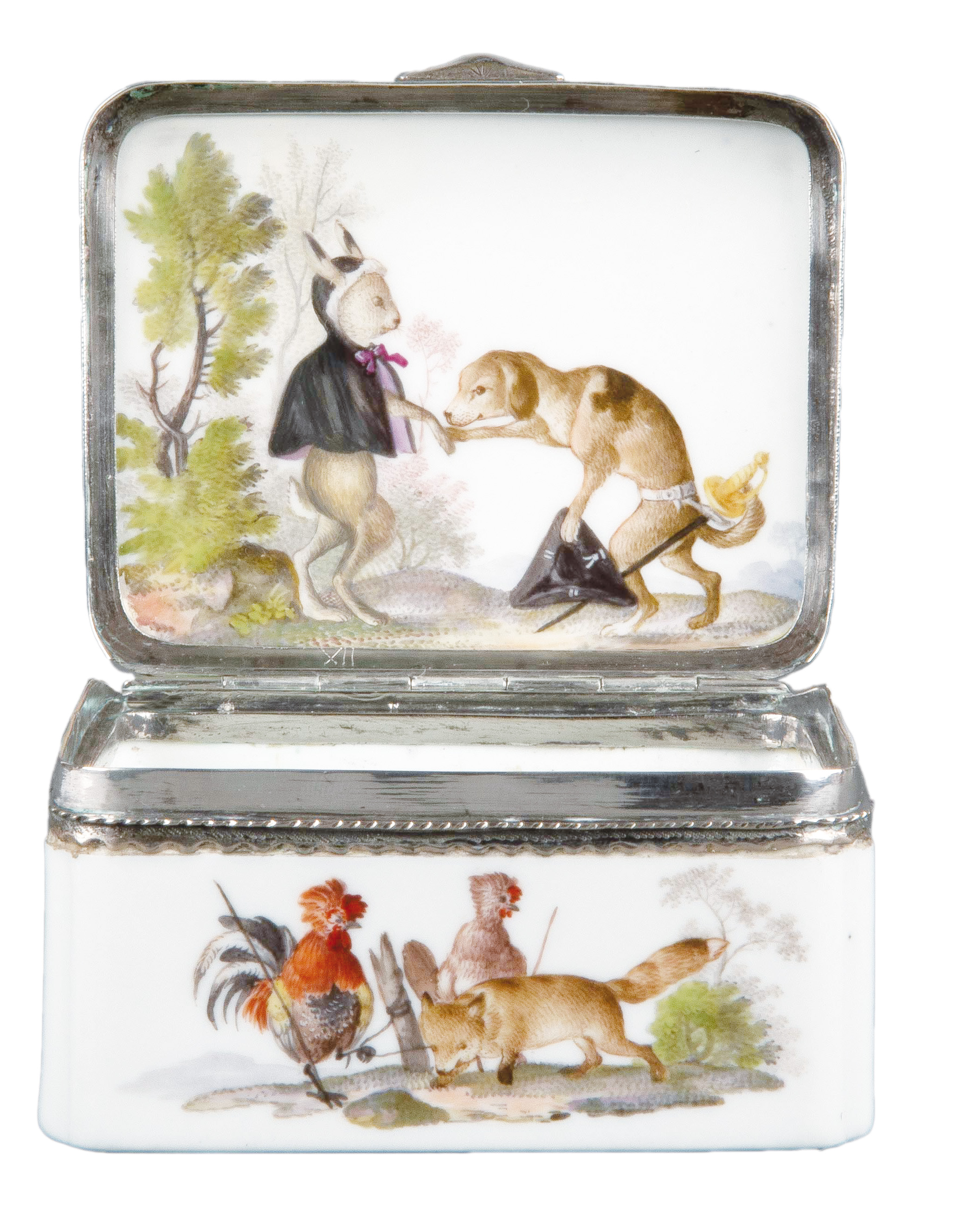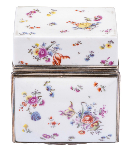 Meissen 1765 Rechteckig, mit nach oben zu öffnendem Deckel, verbunden durch ziselierte Silbermontur. Wandung, Deckel und Innendeckel bunt bemalt mit Tierfabeln in Landschaft. Porzellan, ohne Marke. Vgl. B. Beaucamp-Markowsky, S. 185, Nr. 141. H=4,9 cm, B=8,5 cm, T=7,2 cm € 4.600,- - Katalog-Nr: 27Tabatière