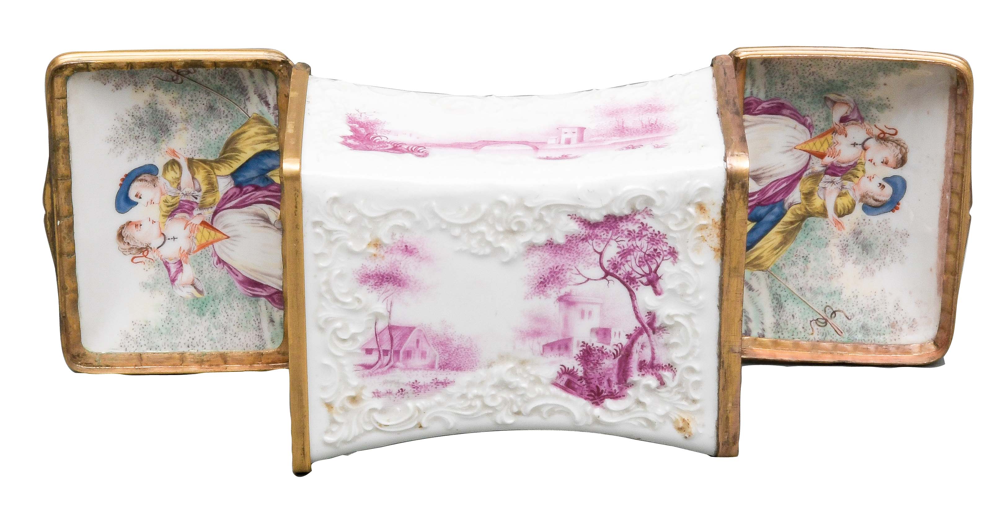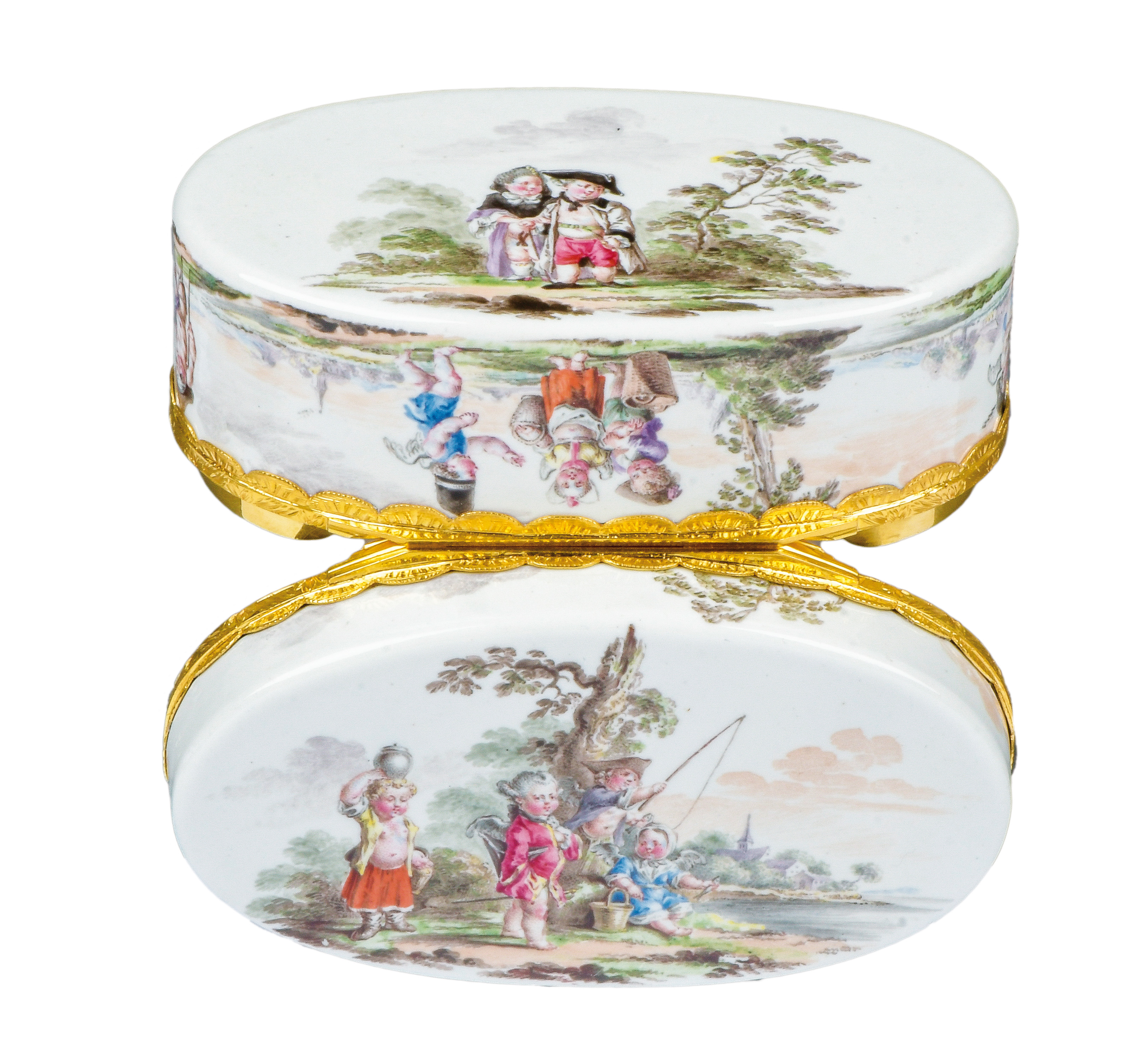 Fürstenberg 1760 Konkav, mit beidseitig an den Böden zu öffnenden Deckeln, verbunden durch reliefierte, vergoldete Montur. Wandung mit Rocaillerelief. Reserven bunt bemalt mit purpurnen Landschaften. Innendeckel bunt bemalt mit Schäferpaar in Landschaft. Porzellan, ohne Marke. Malerei von Heinrich Eisenträger. Vgl. B. Beaucamp-Markowsky, S. 301, Nr. 248. H=6,4 cm, B=9,9 cm, T=4,6 cm € 2.600,- - Katalog-Nr: 32Tabatière