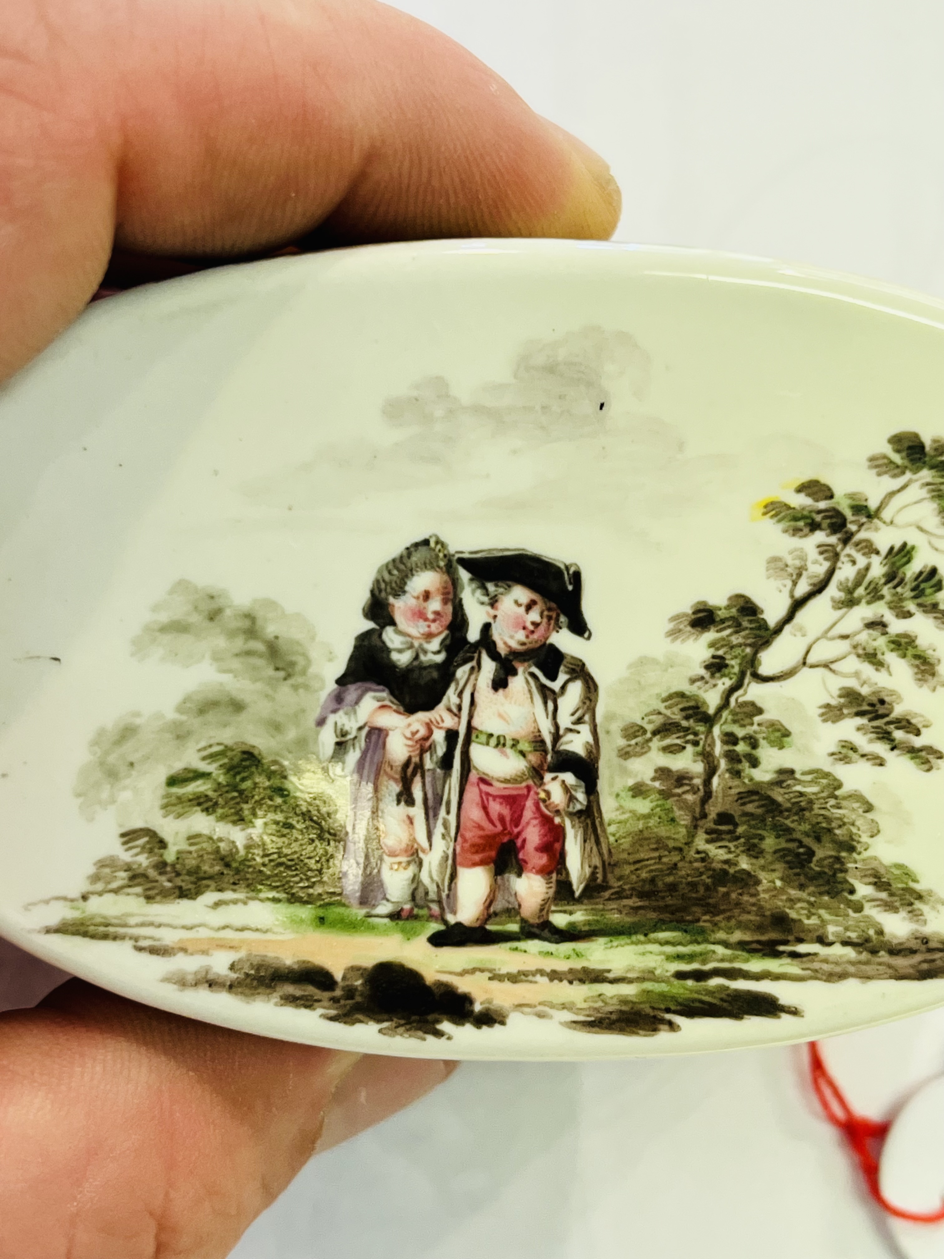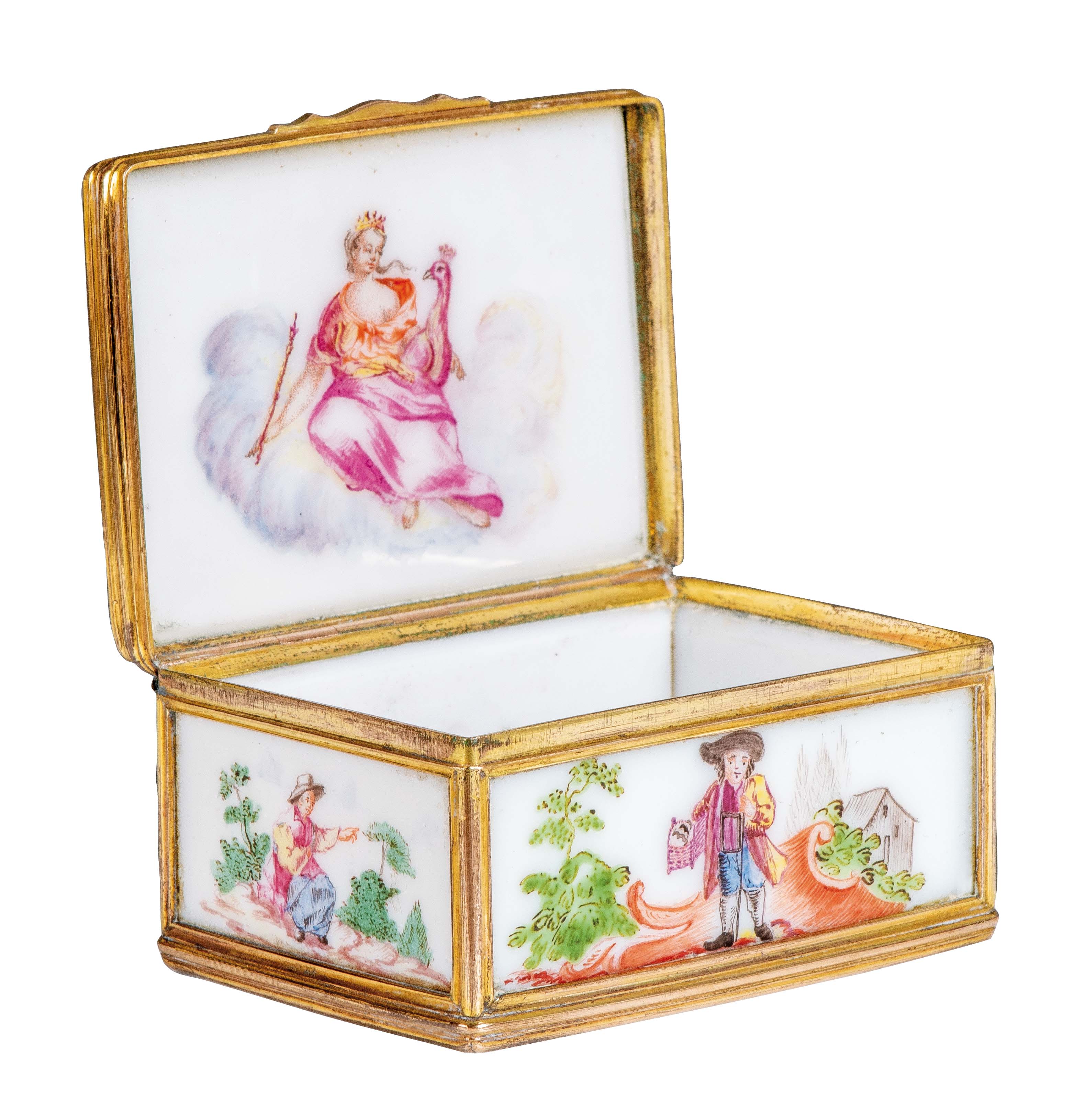 Ellwangen 1753-58 Rechteckig, mit nach oben zu öffnendem Deckel und sechs rechteckigen Beinglastafeln mit Messingmontur. Außenflächen bunt bemalt mit Personenstaffage in Landschaft; die Deckelinnenseite mit der thronenden Göttin Juno. Ohne Marke. Malerei von Johann Andreas Bechdolff. Provenienz: Dr. Adolf Huber. Vgl. W. Rothmaier / E. Veith, „Porzellan aus Ellwangen und Schrezheim“, Ellwangen 2008, S. 15ff, Nr. 2. H=4 cm, B=7,7 cm, T=5,6 cm € 2.500,- - Katalog-Nr: 47Tabatière