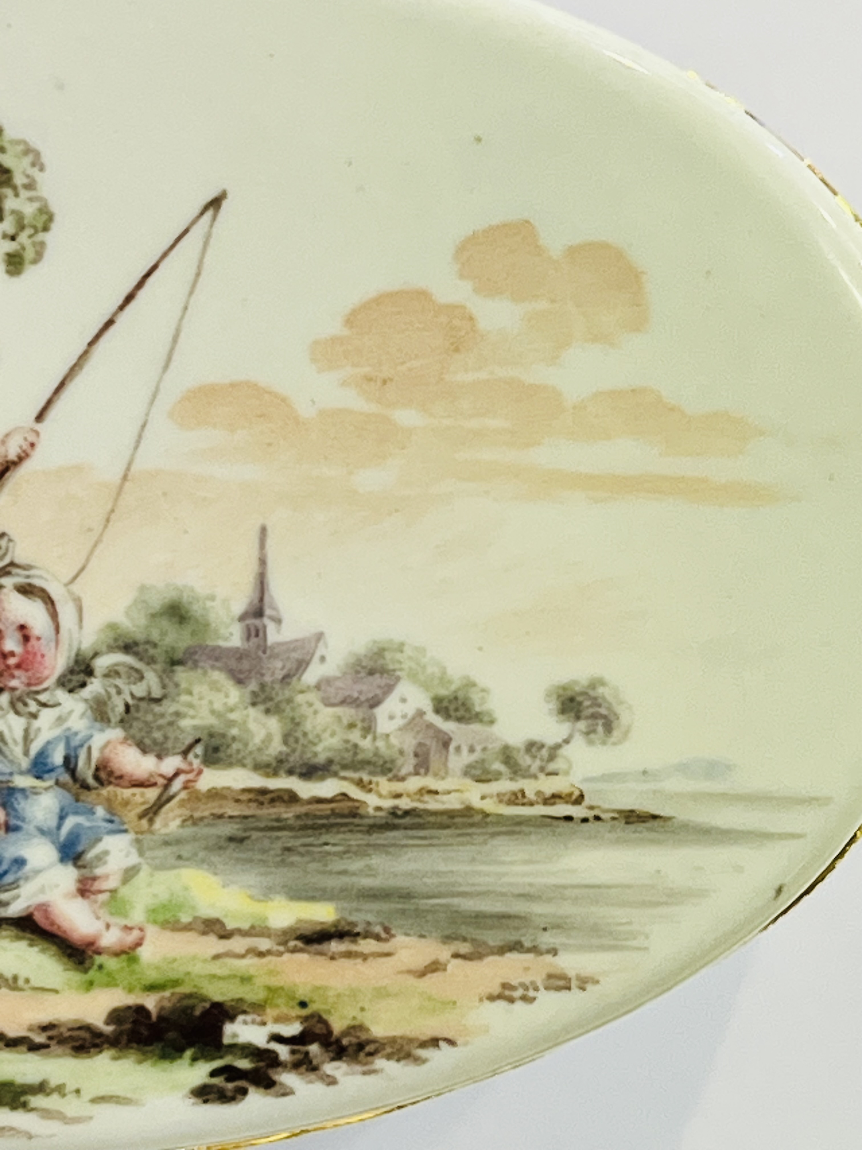 Höchst 1775 Rechteckig, mit nach oben zu öffnendem Deckel, verbunden durch vergoldete Montur. Außenflächen sowie Innendeckel bunt bemalt mit musizierenden und tanzenden Bauern in Landschaft. Porzellan, ohne Marke. Malerei wohl von Johann Heinrich Usinger. H=3,9 cm, B=10,6 cm, T=5,6 cm € 2.500,- - Katalog-Nr: 39Tabatière