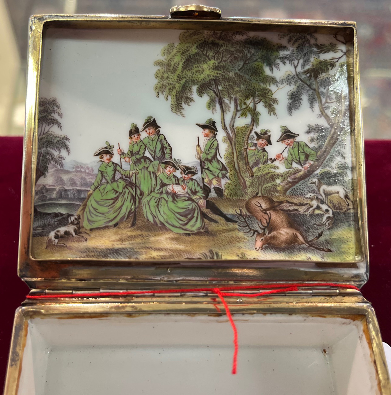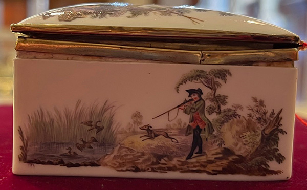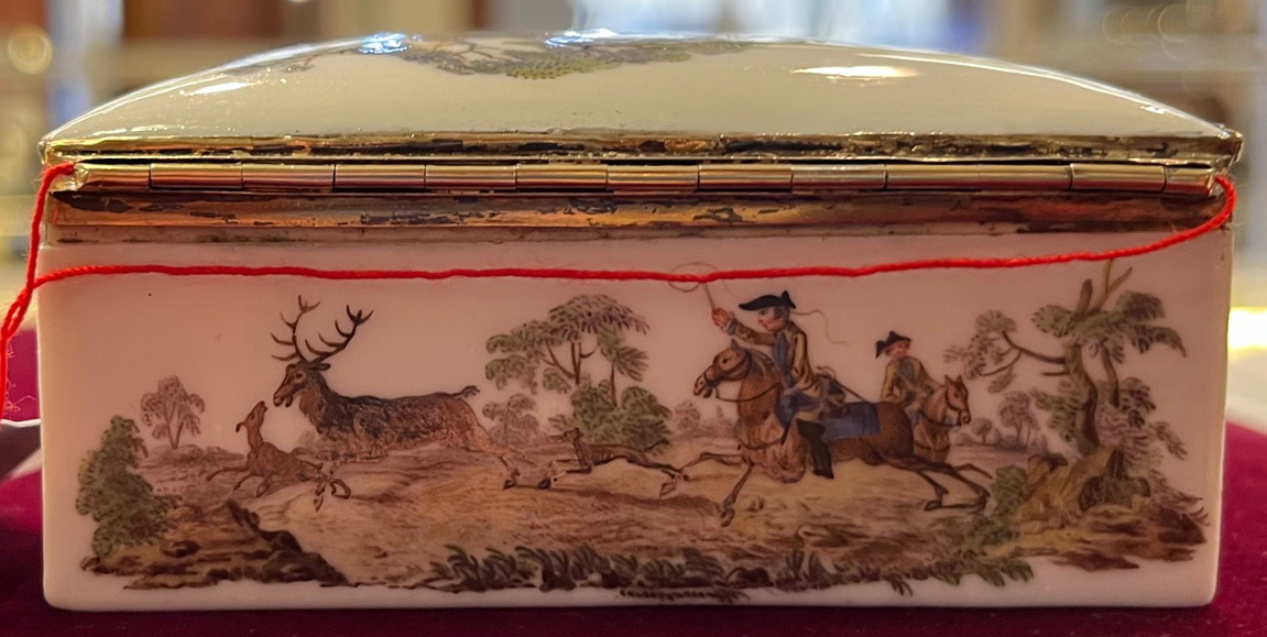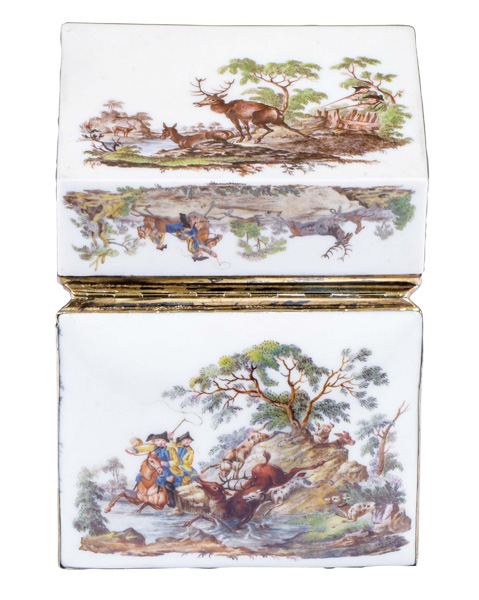 Meissen um 1750 Rechteckig, mit nach oben zu öffnendem Deckel, verbunden durch vergoldete Montur. Außenflächen und Innendeckel fein bunt bemalt mit sächsischen Parforcejagdreitern, Jagdlivree, Piqueure und Hundeführer. Porzellan, ohne Marke. Malerei von Christian Friedrich Kühnel. (an einer Ecke min. nicht sichtbar rest.) H=4 cm, B=8,4 cm, T=7,2 cm € 2.800,- - Katalog-Nr: 31Doppeldeckel-Tabatière
